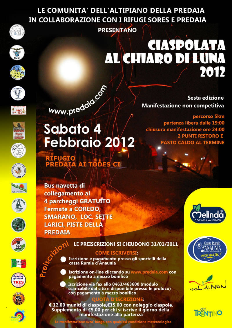 La manifestazione prevede un percorso di circa 5km con due ristori con bevande calde e ghiottonerie. Al termine verra’offerto un pasto caldo presso il “Rifugio Predaia Ai Todesci“. A servirvi un bus navetta che collega i paesi di Coredo e Smarano all’altipiano dalle 16:30 alle 02:00.