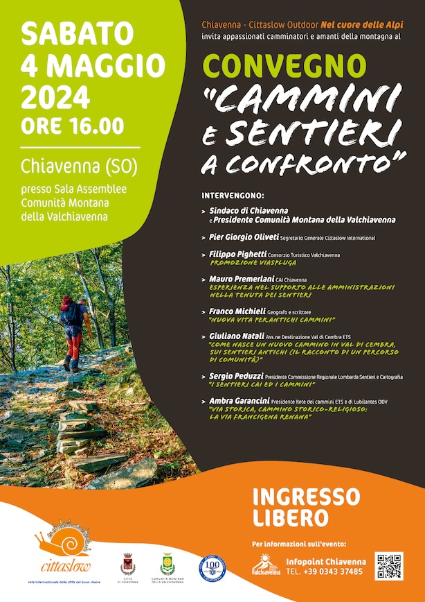 Chiavenna, Cittaslow nel cuore delle Alpi, designata per definire le linee guida del turismo outdoor, organizzaCammini e sentieri a confronto, convegno che si terrà sabato 4 maggio 2024 alle ore 16, nell’ambito dell’evento Cammina Chiavenna.
