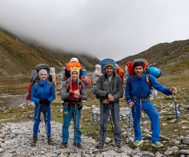 • [I membri della spedizione] hanno attraversato il “Dip” e completato il traverso, un’impegnativa sezione. Sono arrivati a circa quattro tiri (due di roccia e due ripidi di neve) dal punto di bivacco notturno pianificato oltre il Dip.