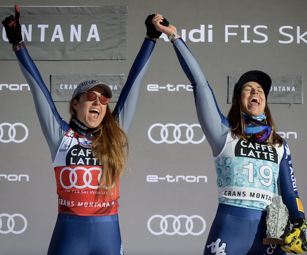 ©Fabrice Coffrini/AFP – Sofia Goggia con Elena Curtoni sul podio di Crans Montana, 2021. Fonte FISI.org