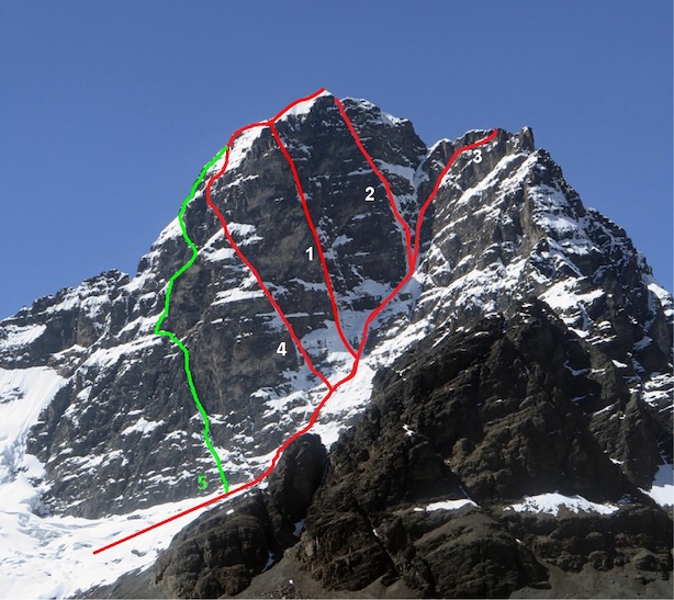 Le vie sulla Sud, con la n.4, aperta lo scorso anno, e la via Imantana (n.5). Fonte Daniele Assolari