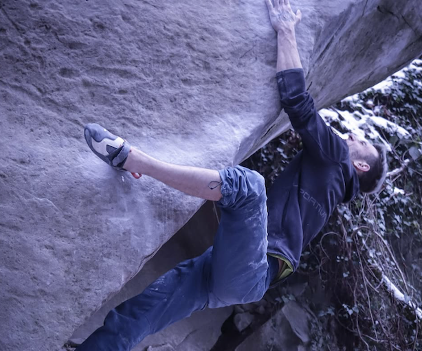 Il masso si divide “in un primo movimento boulder di 8A, un secondo movimento di 8A (difficile) e un finale con una partenza in piedi di 8B/+”, spiega Elia.