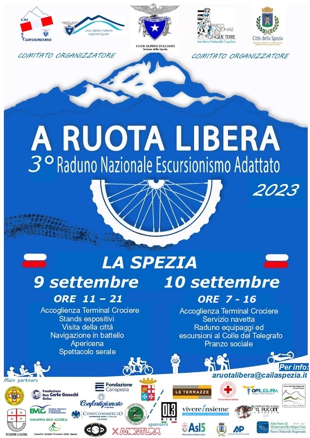 La Spezia si appresta ad accogliere oltre 400 appassionati di montagna da tutta Italia, in occasione della terza edizione del Raduno nazionale di escursionismo adattato “A ruota libera” del Club alpino italiano, in programma sabato 9 e domenica 10 settembre. Saranno due giornate all’insegna della montagna inclusiva, con le quali il Cai intende evidenziare come la frequentazione dell’ambiente montano, con le sue potenzialità nel contribuire al benessere dei singoli individui, sia possibile anche per le persone con mobilità ridotta, grazie ad appositi ausili da fuoristrada e ad accompagnatori opportunamente formati.