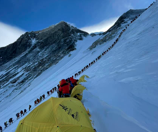 Una lunga fila di alpinisti in marcia verso la vetta dell’Everest, primavera 2021. Fonte: Mingma Dorchi Sherpa/facebook