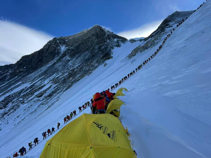 Una lunga fila di alpinisti in marcia verso la vetta dell’Everest, primavera 2021. Fonte: Mingma Dorchi Sherpa/facebook