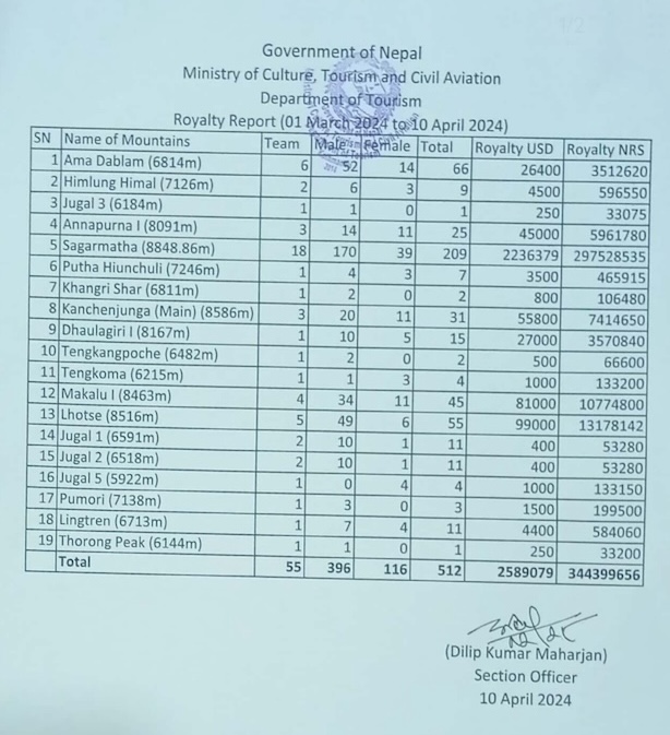 Nella primavera 2023, il DoT rilasciò 478 permessi. La stagione vide quasi 500 ascensioni di successo, comprese quelle effettuate dalle guide Sherpa (che non necessitano di permesso).