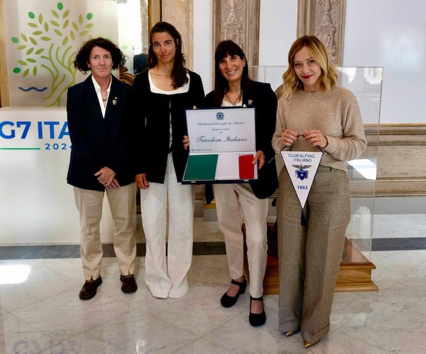 Cristina Piolini, Silvia Loreggian, Anna Torretta ricevono il tricolore da Giorgia Meloni a Palazzo Chigi, 4 giugno 2024. Fonte EvK2CNR/spedizione K2 70