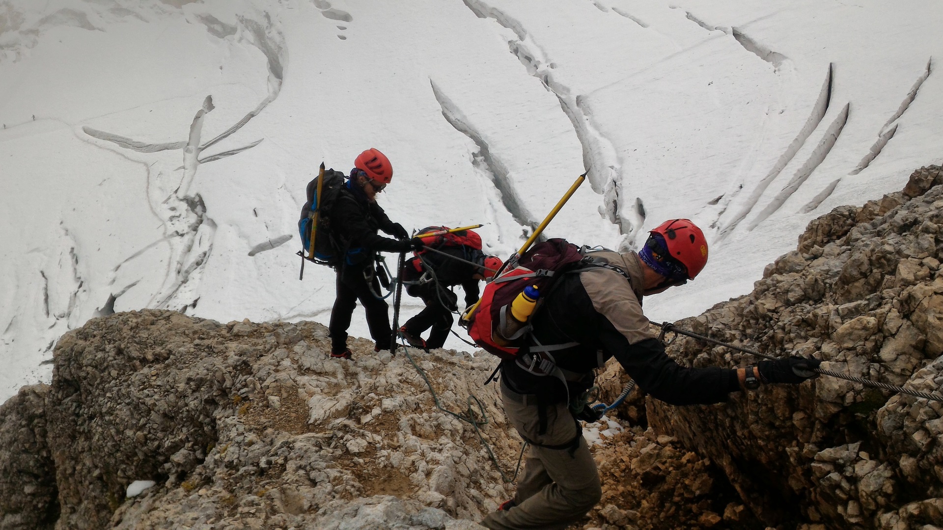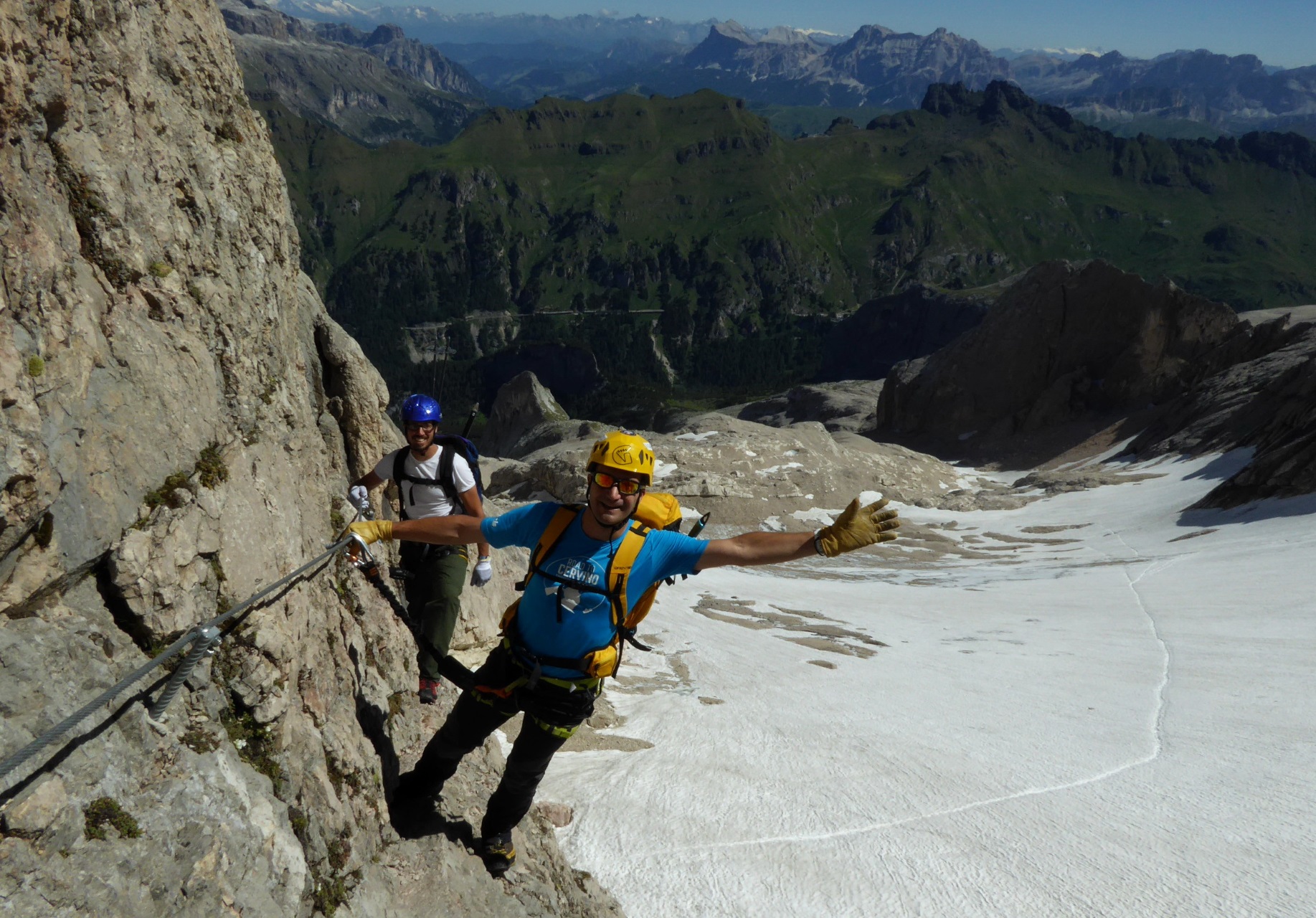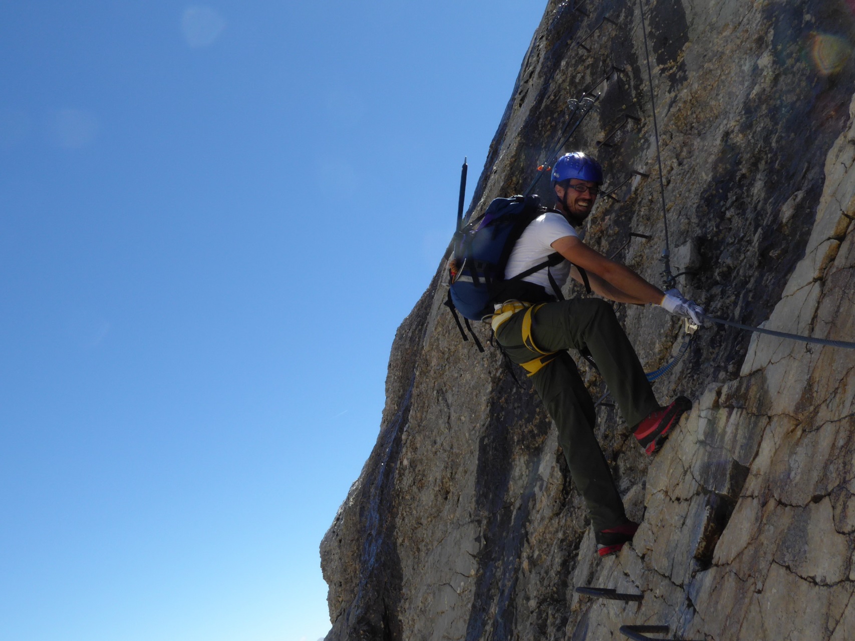 Una volta mi é capitato di ripetere la ferrata ad inizio stagione, probabilmente fine maggio. Il cavo era praticamente tutto sotto la neve e il ghiaccio, fu un’avventura “interessante”, una salita alpinistica d’alta quota nel vero senso della parola, proseguendo spesso a tiri di corda. Mi ricordo che il cliente alla fine, in cima, mi chiese perché non avessi fatto la ferrata e che il giorno dopo voleva ritornare su per farla…