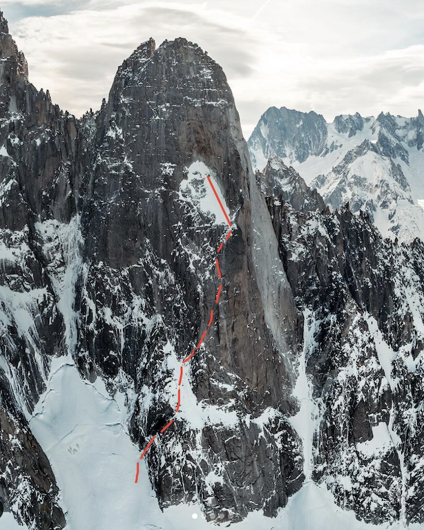 Pierrel ha scalato prima la storica via Allain-Leininger (aperta nel 1935 dai primi salitori della parete Nord), con gli sci sulle spalle e in cordata con Etienne Potof (fresco della scalata sulla parete Nord dei Droites). Insieme hanno superato i primi 16 tiri, fino alla base de La Niche.