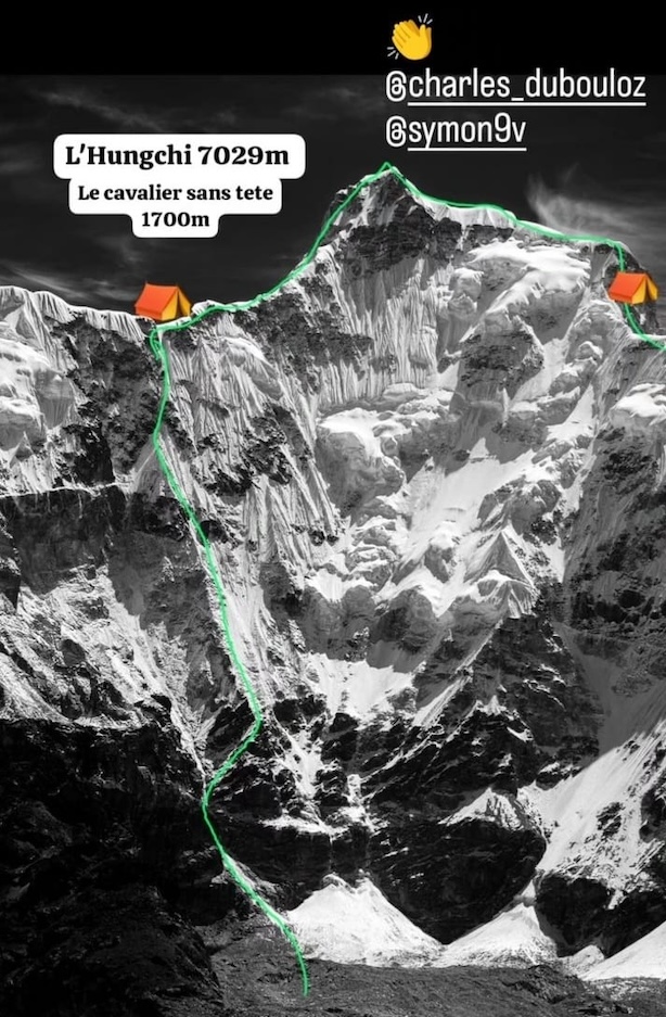 Symon Welfringer e Charles Duboulouz hanno aperto una nuova via in stile alpino sulla parete Ovest dell’Hungchi, una cima di 7.029 metri accanto al Gyachung Kang (7.952 m), nella catena dell’Himalaya, a nord dell’Everest, in territorio tibetano, nella Repubblica Popolare Cinese.
