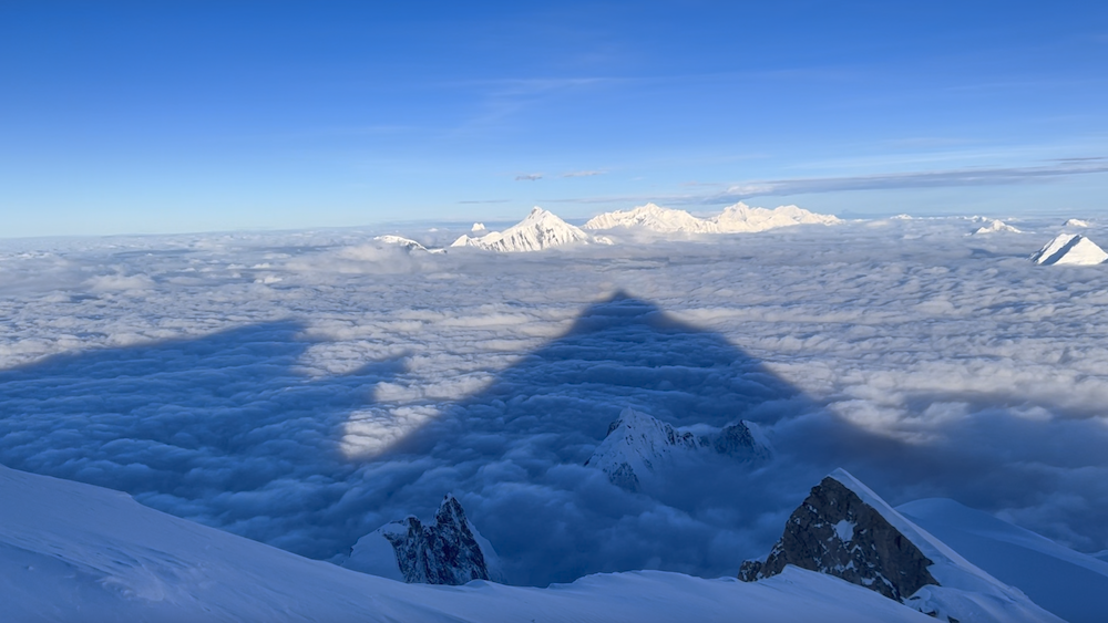 La vetta è rocciosa ma ricoperta da una meringa di neve, non è un posto comodo; un fittone, un cordino e una bandiera americana piantata nella cornice per quest’anno sono il simbolo di riconoscimento della cima 2023: la nuova cima del Manaslu, ovvero il punto più alto a 8163 metri, considerata nuova cima solo dal 2022.’’