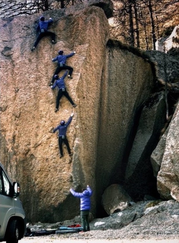 “Il tempo pazzesco di questo periodo ha visto un’escursione termica di più di 20° in due giorni, e la volta successiva che sono tornato in Valle Orco c’erano 5° e un forte vento. Con temperature più fresche, i movimenti sembravano molto più gestibili e sono riuscito a collegare il tiro chiave e poi l’intera linea, alcune volte su corda. Purtroppo ho avuto seri problemi per l’insensibilità delle dita a causa del freddo! […]”