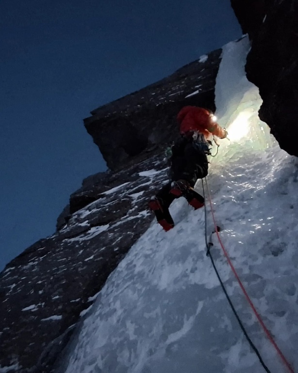 Quando è arrivato sul posto, ha scoperto con sorpresa che la linea che aveva individuato durante una prima visita nel 2020, tra le classiche linee di ghiaccio di Rubben e Rubbsnytten, si era formata. Poche ore dopo, era ai piedi della cascata in compagnia dello scozzese Orlando Addis. Dopo una scalata di misto che ha richiesto loro il massimo impegno, i due hanno completato la via nell’oscurità del Circolo Polare Artico: “Sarebbe stato piacevole salire questa linea alla luce del giorno, ma c’è qualcosa di stranamente magico nell’arrampicare all’inizio di una notte polare”, ha commentato Knuuttila.