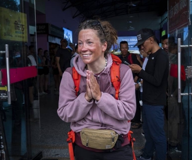 Kristin Harila al suo arrivo a Kathmandu, il 6 giugno 2023, dopo la scalata dell’Annapurna. Foto AP. Fonte The Himalayan Times