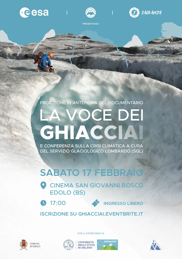 Sabato 17 febbraio, a partire dalle ore 17.00, si terrà presso il Cinema Teatro San Giovanni Bosco di Edolo (BS) una proiezione in anteprima del documentario “La voce dei ghiacciai” scritto e diretto da Giacomo Andalò, in collaborazione con il Servizio Glaciologico Lombardo, con la partecipazione dell’ Agenzia Spaziale Europea e il patrocinio del Comune di Edolo, di UNIMONT, polo d’Eccellenza della Statale di Milano, e del Parco regionale dell’Adamello.