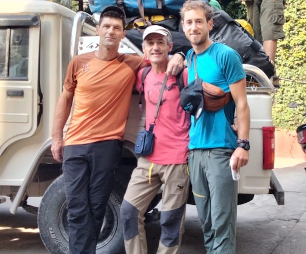 Juan Vallejo, Mikel Zabalza e Iker Madoz insieme all’autista locale, prima di partire da Kathmandu. Fonte: Diario de Navarra