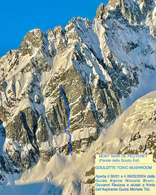 Una squadra formata dalle guide alpine Niccolò Bruni e Giovanni Ravizza ha aperto, con l’aiuto dell’aspirante guida Michele Tixi, un’interessante goulotte sulla parete dello Scudo Est del Mont Noire de Peuterey, ai piedi dell’Aiguille Noire de Peuterey, nel massiccio del Monte Bianco.