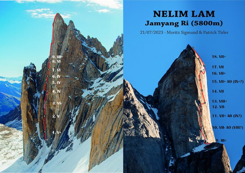 Obiettivo della giovane cordata altoatesina, il Jamyang Ri (5.800 m), che contava una sola salita, quella degli sloveni Matija Jost e Matjaz Dusic nel 2017. Lì, il 21 luglio hanno aperto ‘Nelim Lam’ (700 m, VIII+, A0).