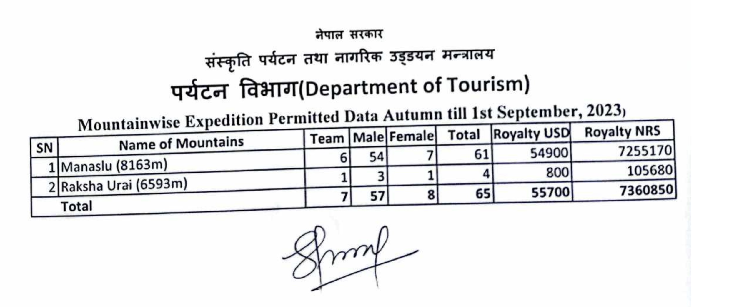 Il Dipartimento del Turismo del Nepal ha pubblicato la prima lista di alpinisti stranieri a cui è stato concesso il permesso per scalare il Manaslu (8.163 m) nella prossima stagione autunnale.