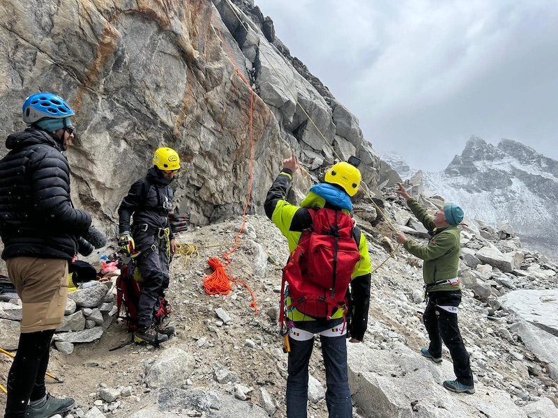 “Ieri abbiamo completato il primo giorno di lavoro ad attrezzare la via che salverà vite umane nei prossimi anni – ha segnalato poche ore fa l’alpinista francese – Questa nuova via si chiamerà finalmente “Sundaré Sherpa MB”. L’intera squadra ha raggiunto i piedi della via. Loïc, alpinista professionista, e Kévin, eccellente scalatore, hanno collocato alcuni picchetti metallici utilizzando la corda fissa che avevo sistemato l’anno scorso, poco prima di accusare una brutta sciatica. La carica e l’efficienza di tutto il team mi hanno risollevato il morale. Non devo dimenticare la presenza e l’efficienza di mia figlia maggiore Cathy. Più di una settimana fa, abbiamo accolto nel nostro team un giovane scozzese che ha festeggiato con noi il suo 19° compleanno, che partecipa attivamente all’attività. Con Olivier Morgan ora siamo una spedizione internazionale “.