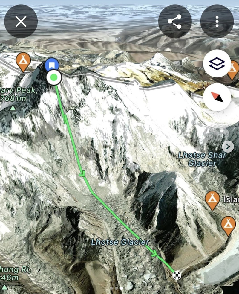 Tim Howell, tentativo di lancio in tuta alare dalla cima del Lhotse: la traiettoria prevista da Howell. Fonte instagram