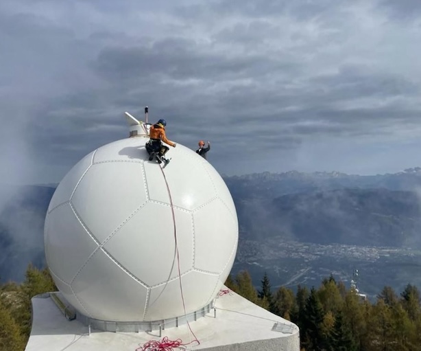 Nuovo radar meteo sul Monte Macaion: l’installazione del ‘radome’ a protezione dell’antenna radar. Fonte Servizio Prevenzione rischi e Cue