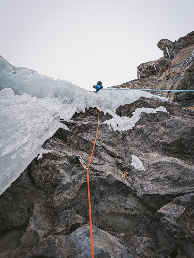 Proprio durante una recente ripetizione della “Trip in the Night” insieme a Giulia Compagnoni, Leo Gheza ha individuato una possibile alternativa sulla destra. “Ho notato delle frange interessanti e una roccia sana. Le condizioni erano buone, così il giorno dopo sono tornato con Luca Matteucci e abbiamo provato a salire quella linea”, racconta. La via è stata aperta interamente dal basso, seguendo un tracciato sostanzialmente indipendente dalla cascata principale.