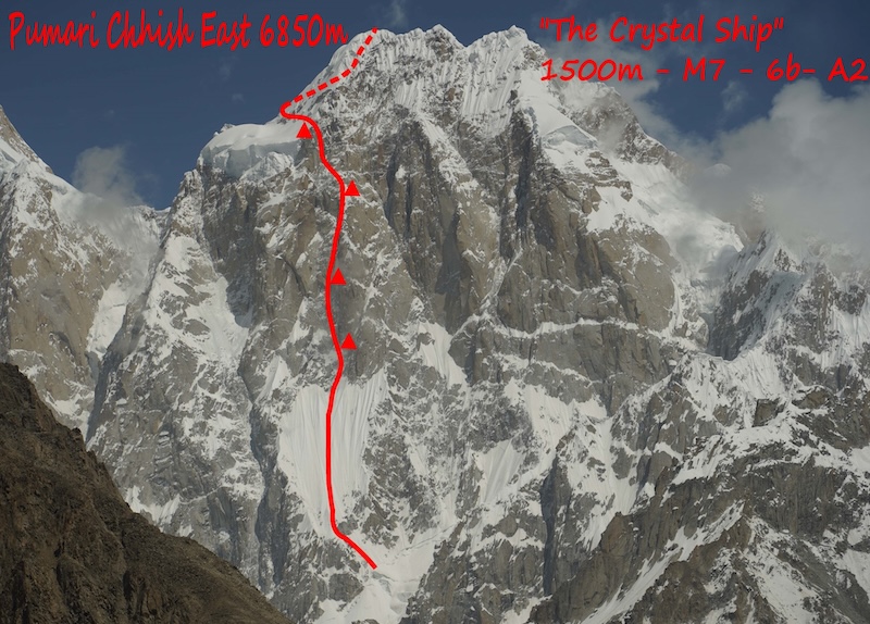 La loro linea, battezzata The Crystal Ship, è lunga 1.600 metri e risale la parete Sud e la cresta superiore Ovest. Il team l’ha classificata come 6b A2 M7. La discesa è avvenuta attraverso la stessa via.