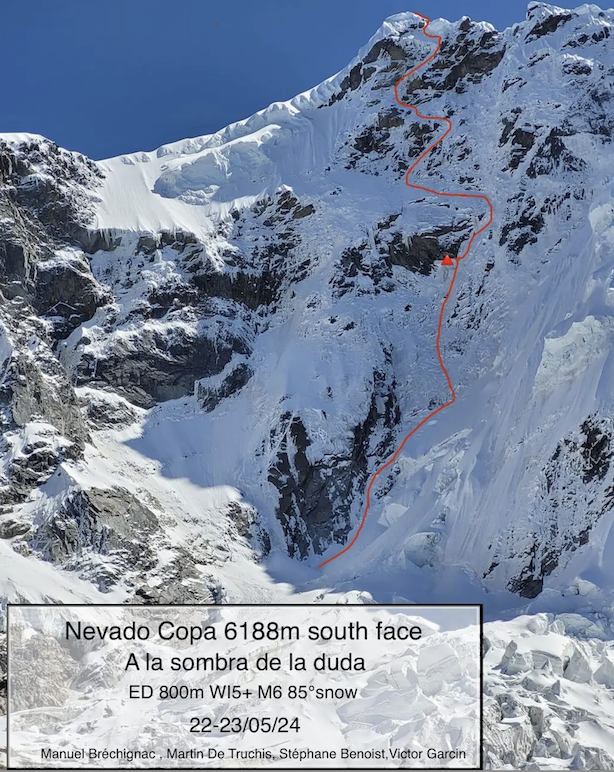 Il GEAN – Gruppo di Eccellenza Alpinistica della Féderation Française des Clubs Alpins et de Montagne (FFCAM) ha effettuato una spedizione nella Cordillera Blanca (Ande peruviane), che si è conclusa con due interessanti ascensioni. La più importante è stata l’apertura di una nuova via sulla parete Sud del Nevado Copa (6.188 m), da parte di Manu Bréchignac, Martin de Truchis, Stéphane Benoist e Victor Garcin il 22 e 23 maggio.