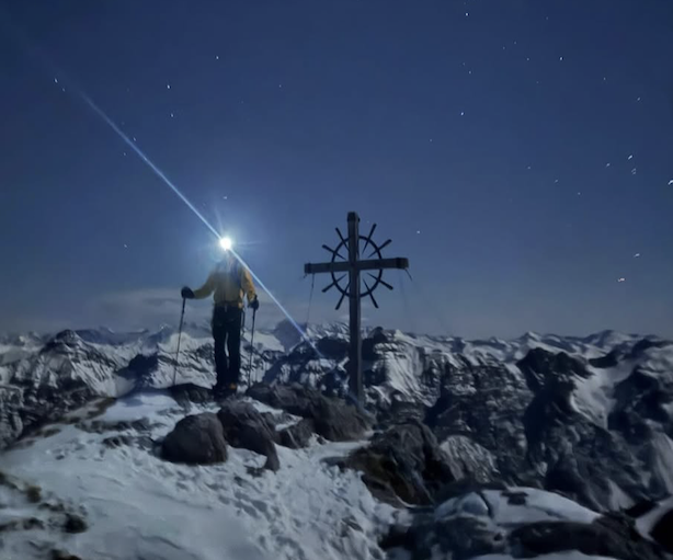 “Dopo aver fatto un primo tentativo all’inizio della settimana [14 gennaio] e aver abbandonato poco prima della Hochtennspitze, Lukas Waldner ed io ci abbiamo riprovato ieri [domenica 19 gennaio]. Con la consapevolezza del tentativo precedente e una partenza anticipata siamo stati davvero veloci anche se le condizioni della neve erano tutt’altro che perfette. Siamo partiti alle 2.30 dal parcheggio di Schlick, abbiamo attraversato Niederer e Hoher Burgstall e abbiamo raggiunto la Schlicker Seespitze alle 8.00 in punto. Abbiamo attraversato tutte le cime principali e alcune minori che sembravano importanti (in tutto 16 vette). Siamo riusciti a salire tutto in giornata e abbiamo raggiunto l’ultimo colle, l’Halsl, al tramonto. Le ultime centinaia di metri fino alla vetta finale sono state piuttosto estenuanti, ma sapevamo che ce l’avremmo fatta. Alle 18.35 abbiamo raggiunto la Nockspitze e siamo scesi a Götzens dopo 17,5 ore di cammino, 4200+ metri di dislivello e 31 km di distanza.”