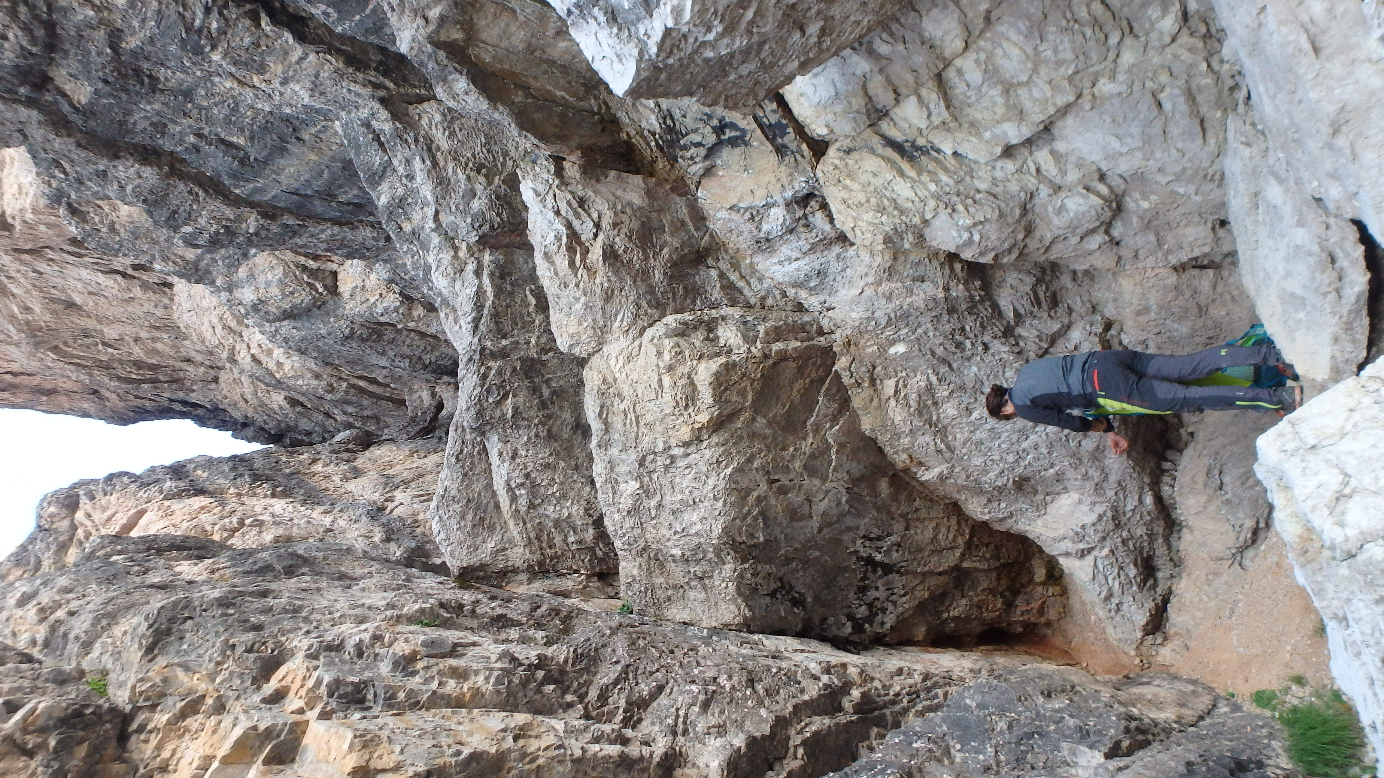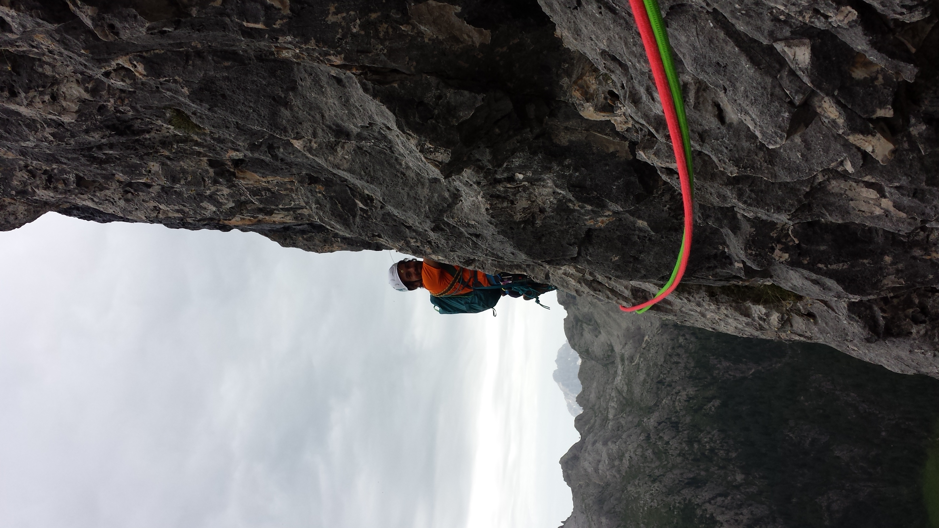 La pioggia ci ha sorpresi alla forcella e già temevamo di sentir rombare i tuoni e di vedere le rocce rotolare giù assieme all’acqua che si sarebbe incanalata in quel tunnel infernale. Ma… era scritto che non succedesse e che anche le calate fossero la chiusura di una giornata specialissima. Il pensiero, mentre, riparati dal tetto sovrastante, radunavamo la nostra “ferramenta” e ci lanciavamo per i ghiaioni sottostanti è stato ovviamente per il grande Cassin, che ai suoi tempi ha aperto una grande via, con mezzi che noi ci sognamo e con una tenacia che gli invidio.
