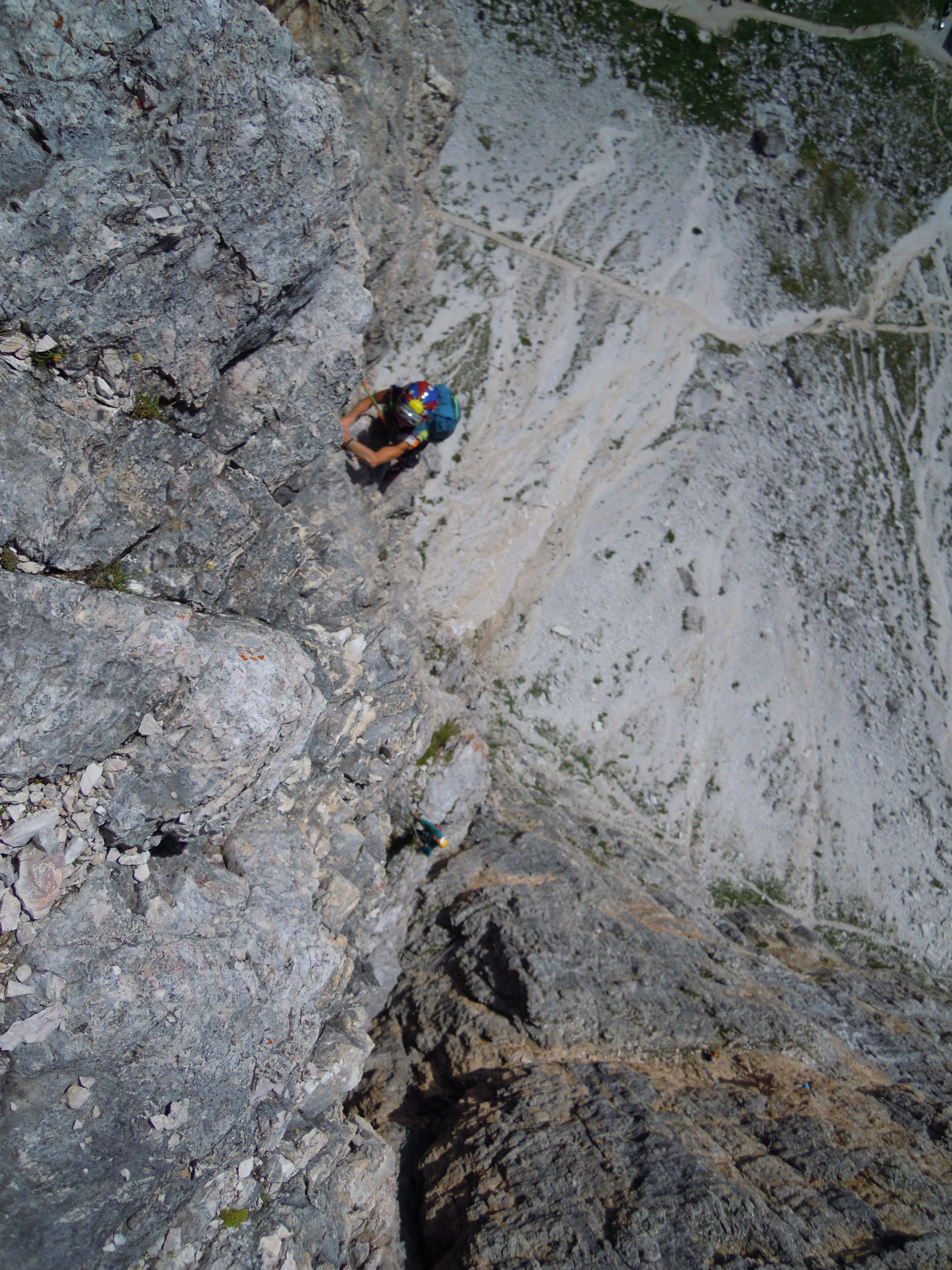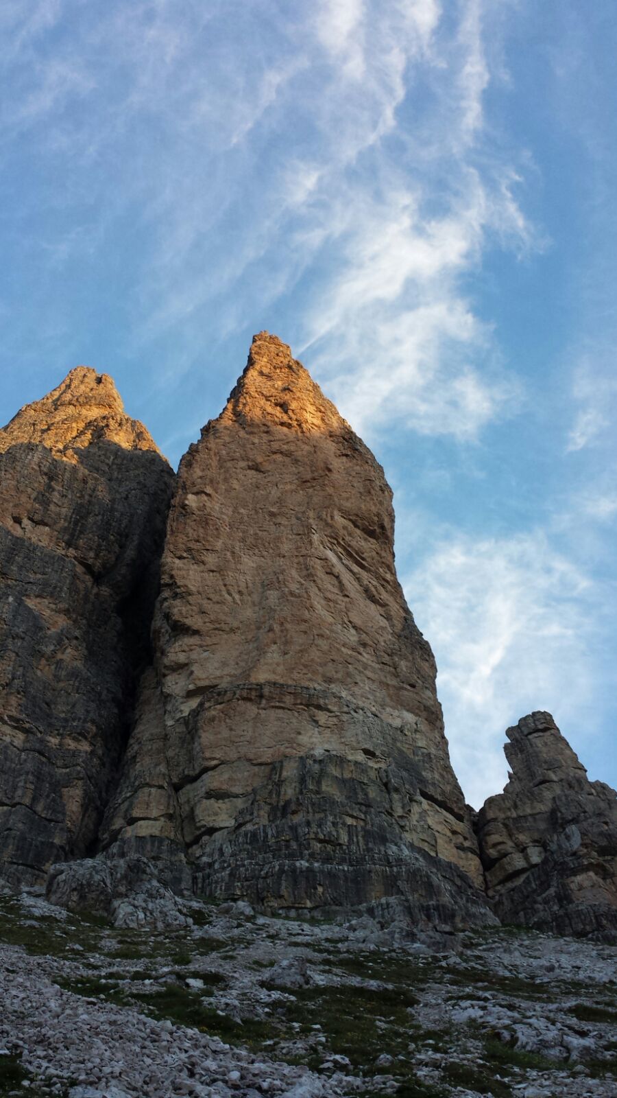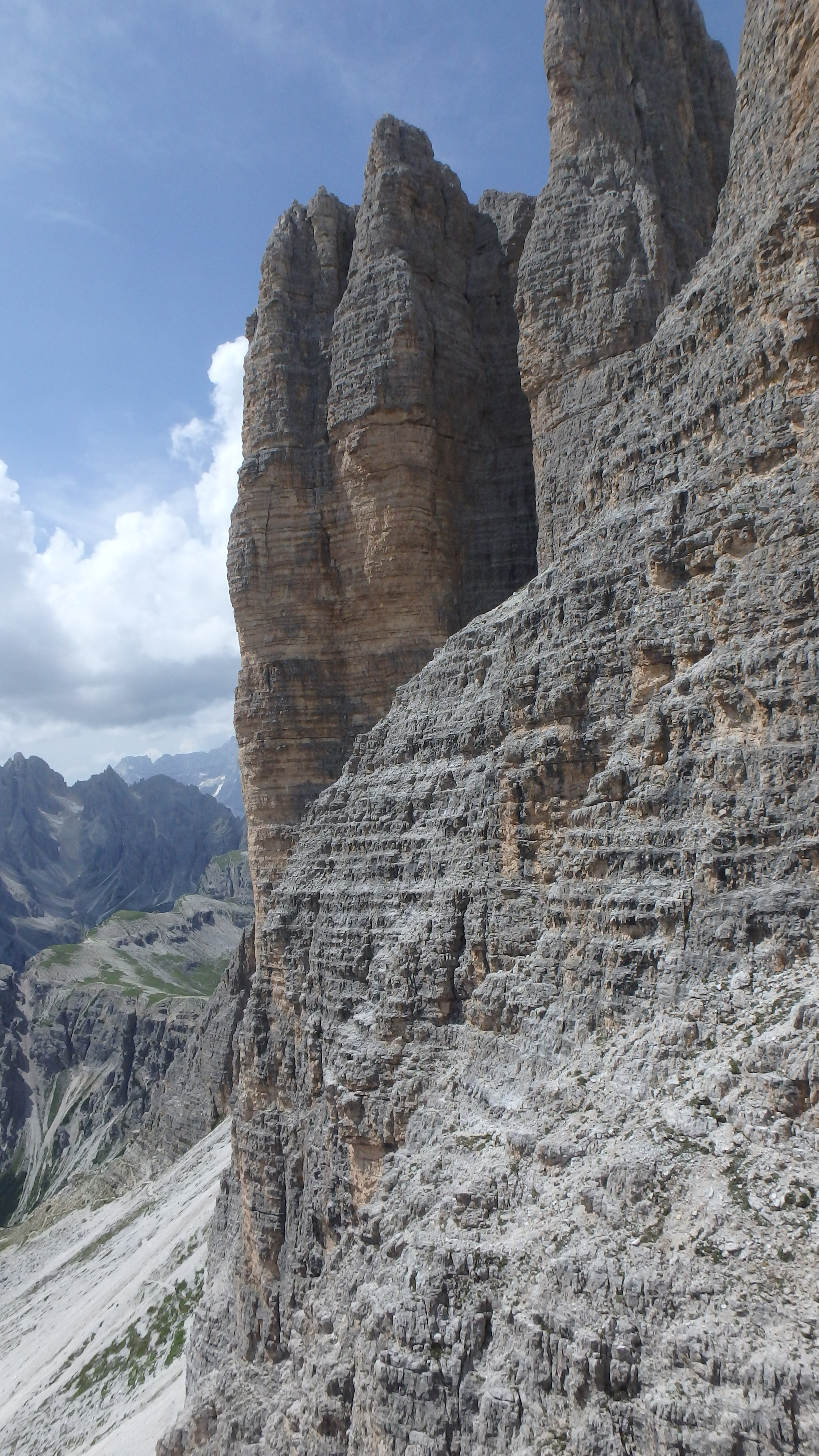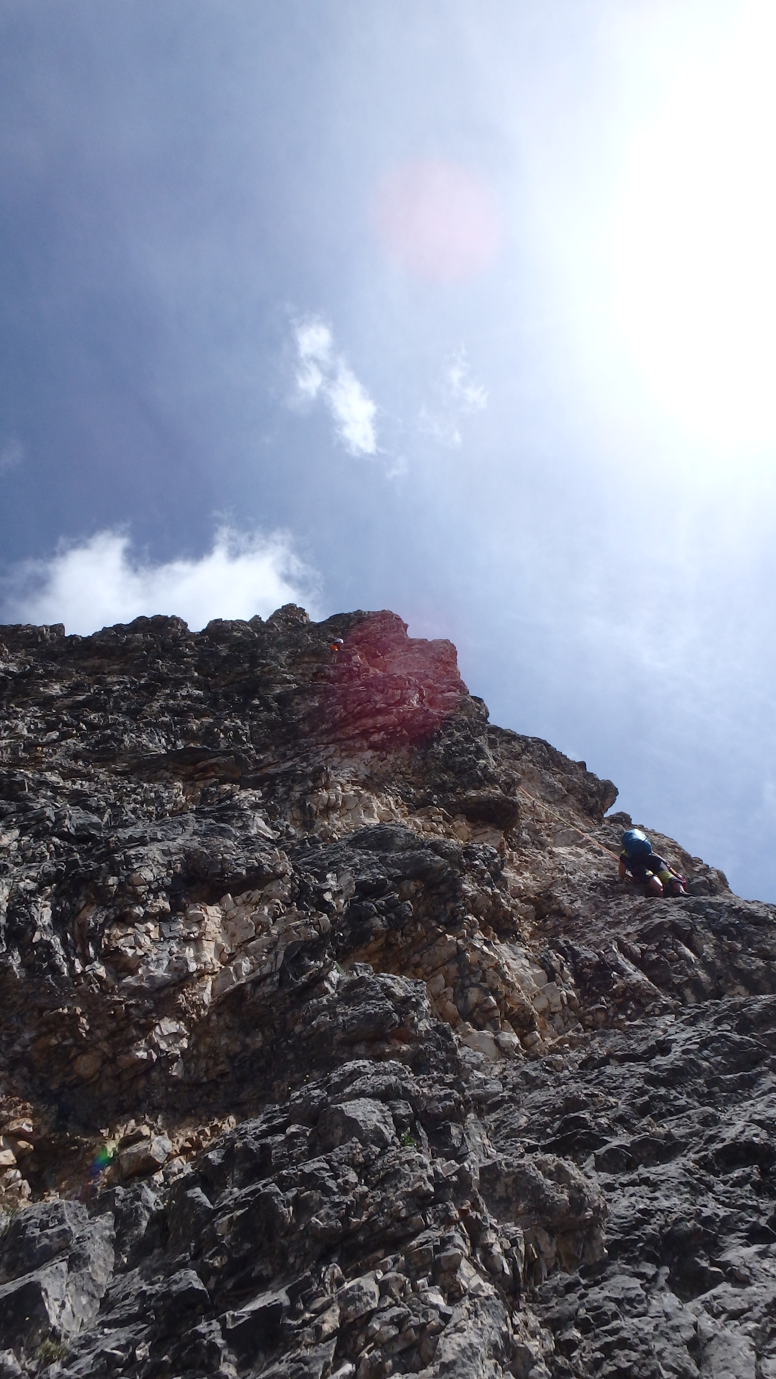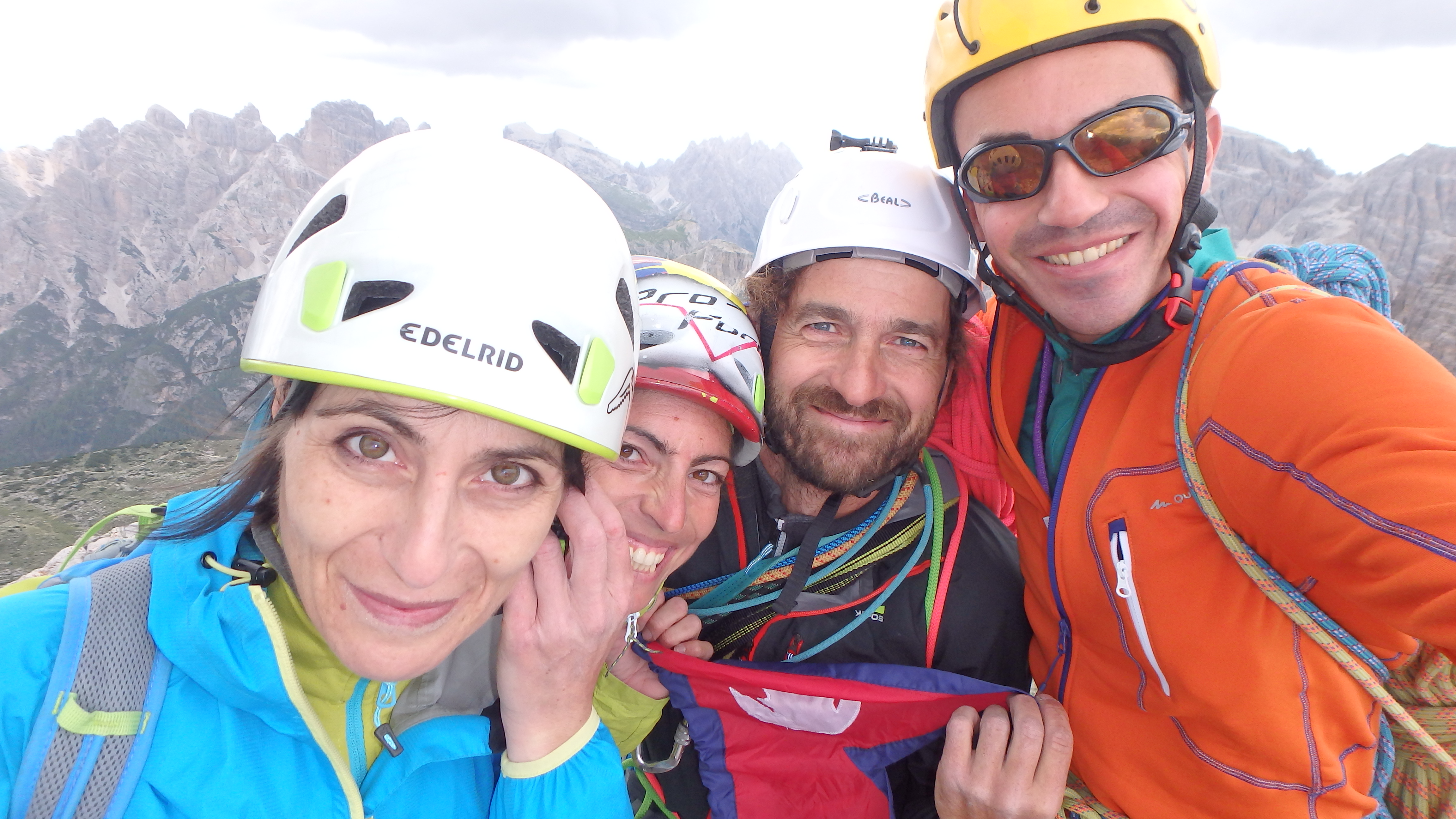 Salivamo tenendoci tutti d’occhio, attenti al tempo che lentamente, da sereno, ha lasciato spazio a nuvole sempre più fitte e grigie. Condividere: ”dividere-con”… salire con nella testa l’obiettivo della cima, ma pronti anche a ripiegare nel caso in cui qualcuno non ce l’avesse fatta o avesse preferito scendere. E la cima ci è apparsa come per magia, proprio mentre mi stavo divertendo, proprio mentre avrei voluto continuare… attorno un panorama grandioso: le Nord delle Tre Cime, i ghiaioni sottostanti, la gente che ci guardava lontana, piccoli come formiche, le Dolomiti attorno nella loro maestosa bellezza… quanto ci siamo sentiti piccini lassù!
