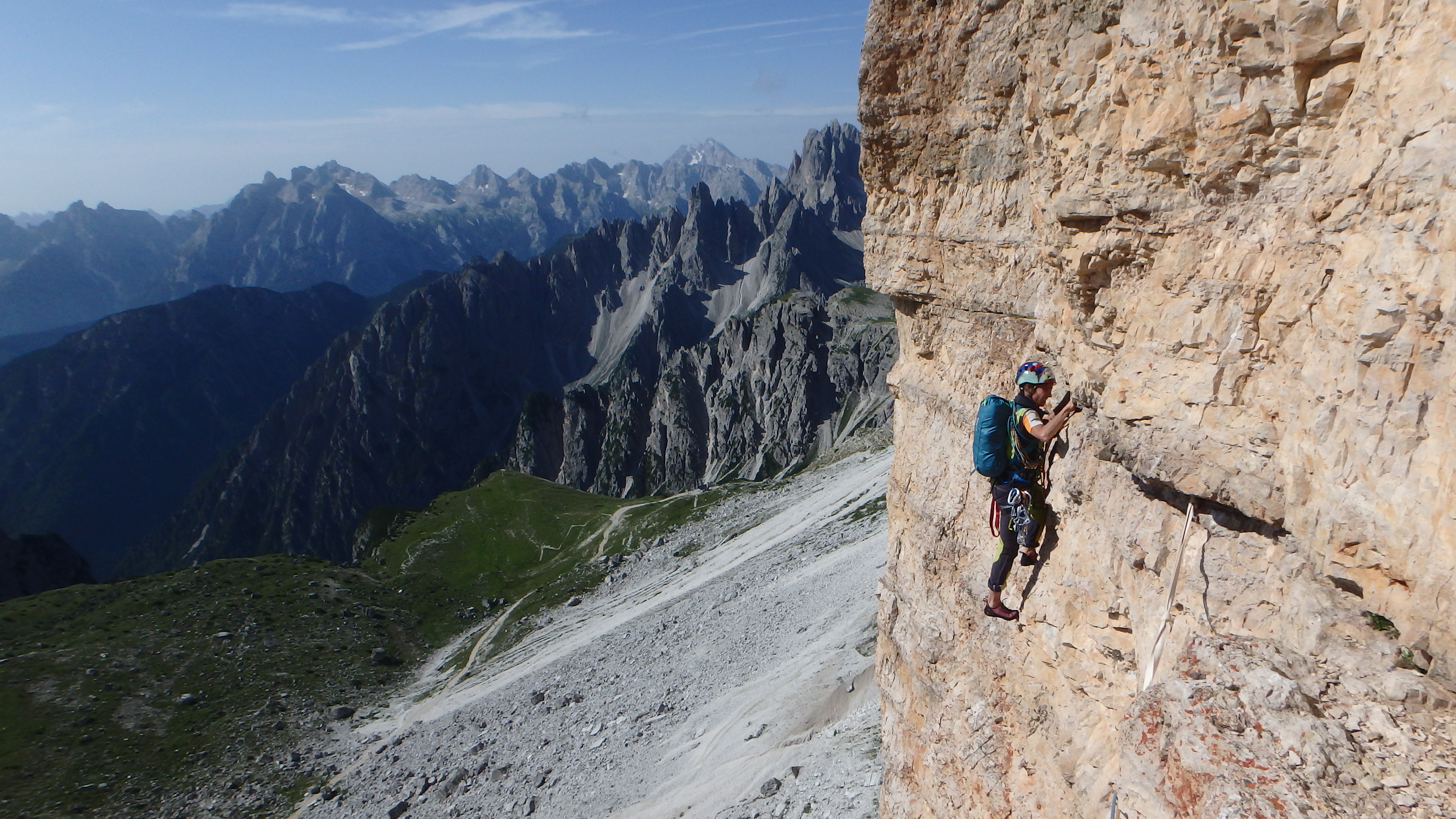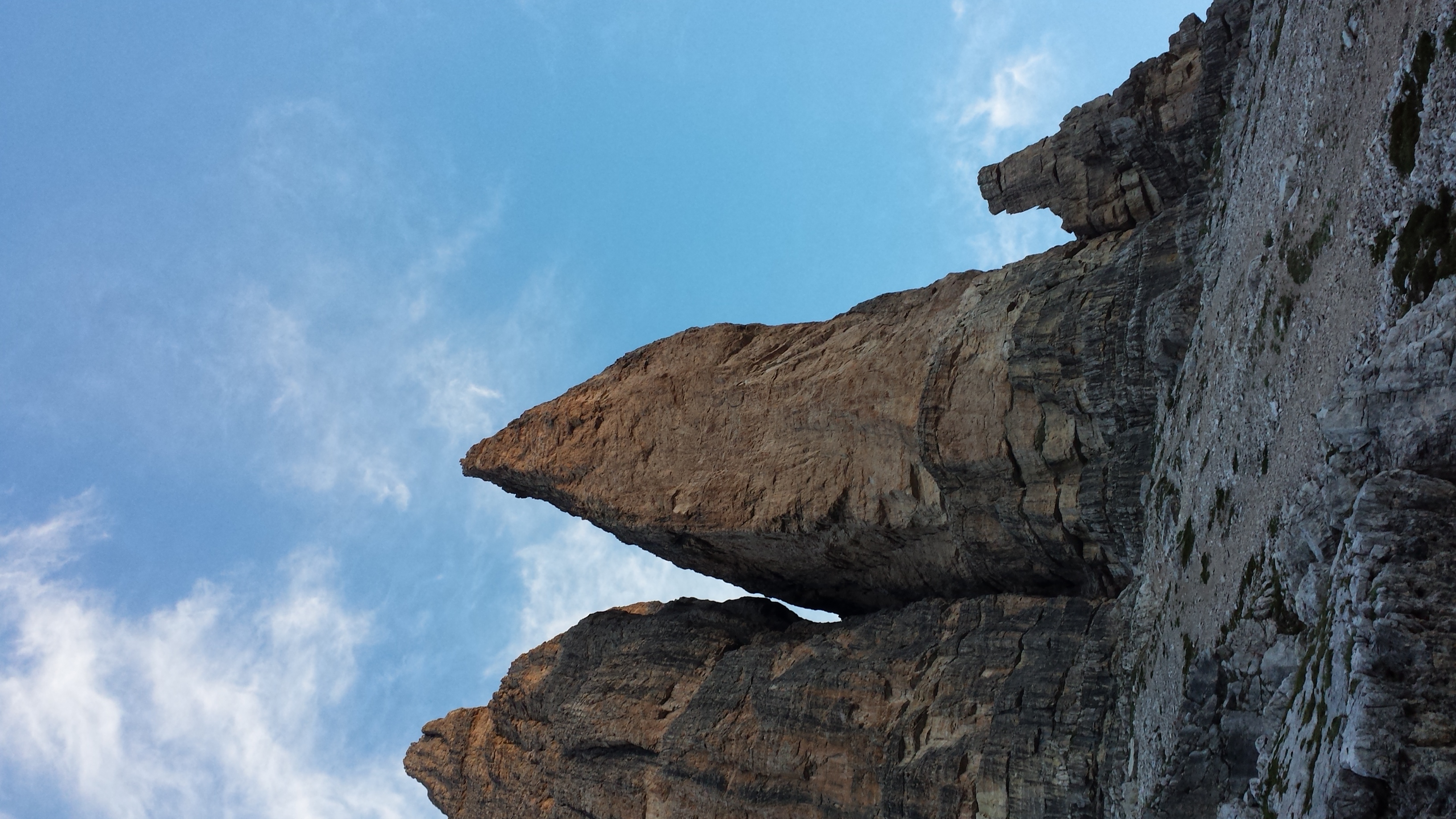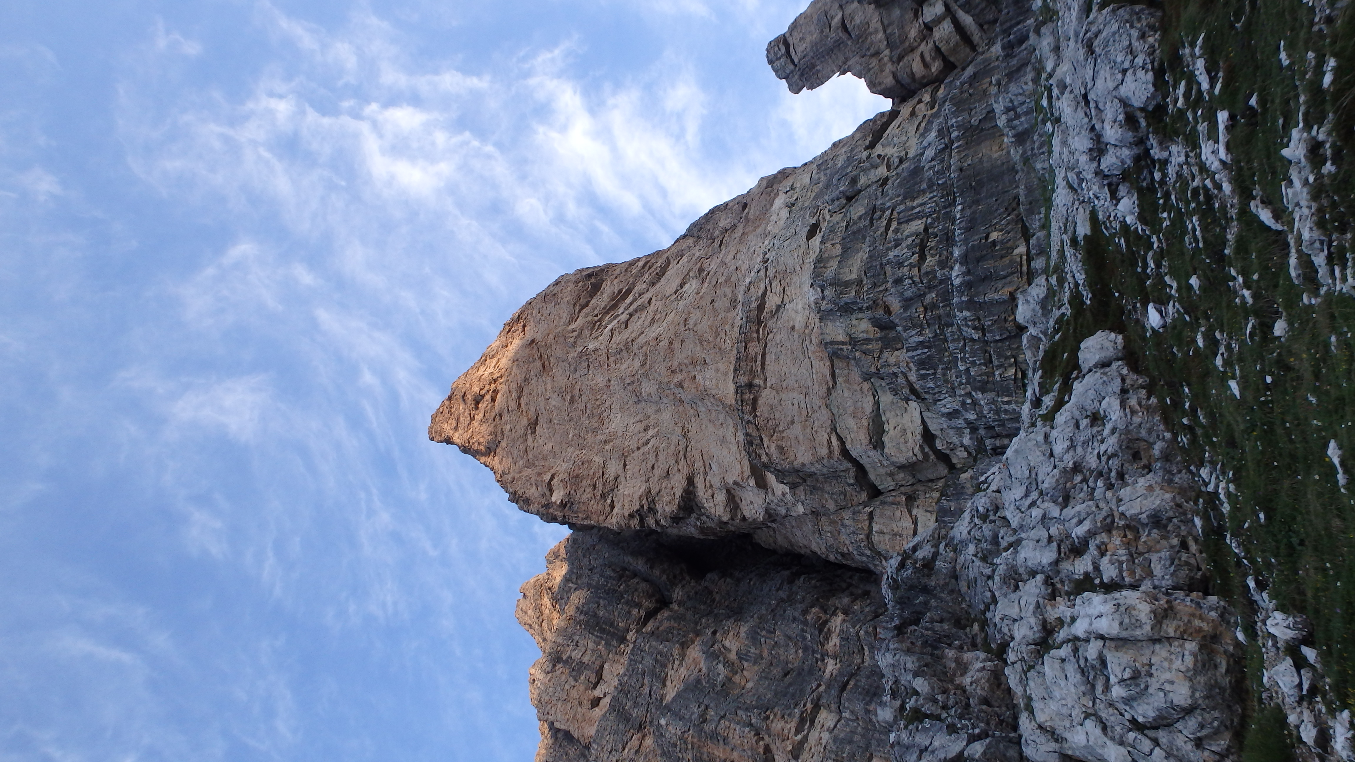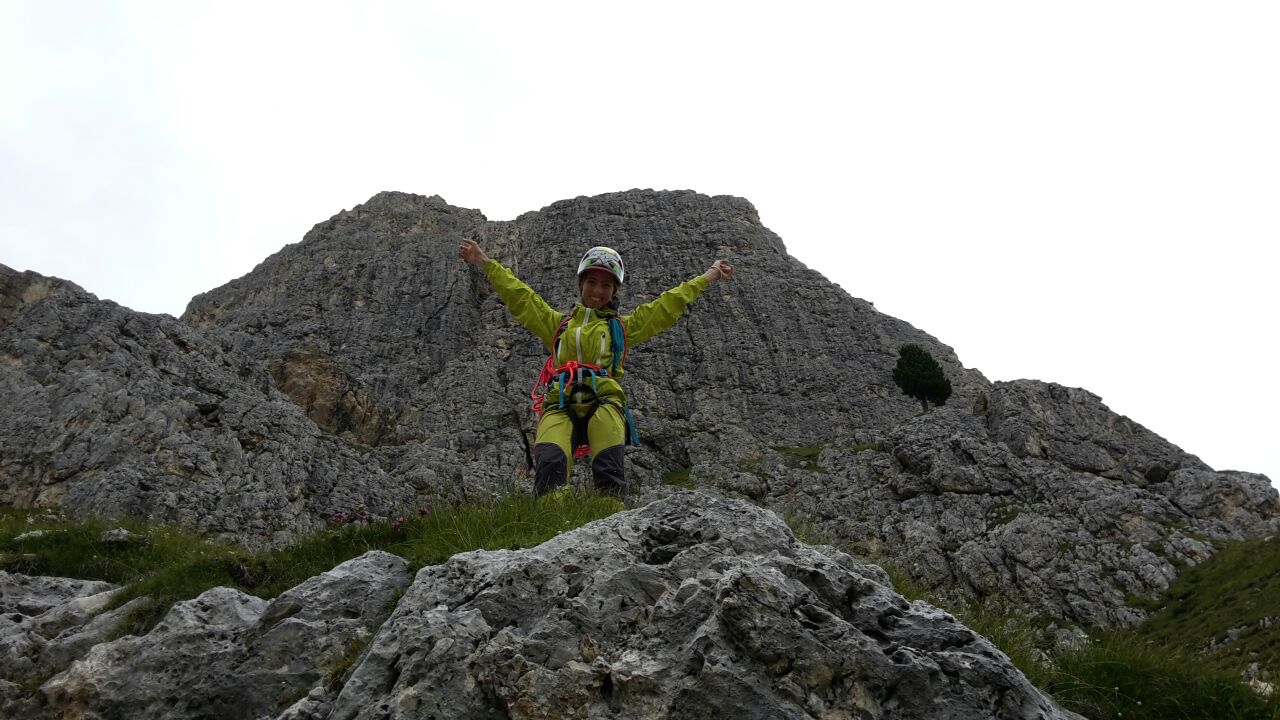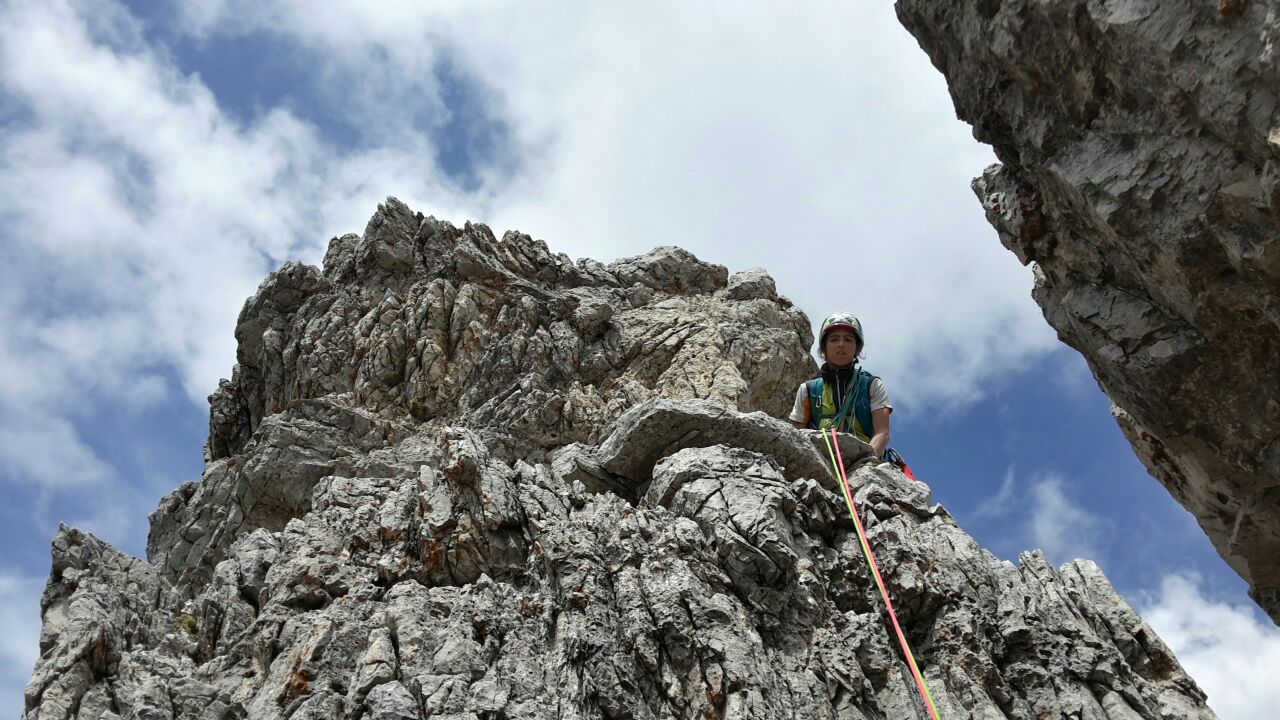 Salivamo tenendoci tutti d’occhio, attenti al tempo che lentamente, da sereno, ha lasciato spazio a nuvole sempre più fitte e grigie. Condividere: ”dividere-con”… salire con nella testa l’obiettivo della cima, ma pronti anche a ripiegare nel caso in cui qualcuno non ce l’avesse fatta o avesse preferito scendere. E la cima ci è apparsa come per magia, proprio mentre mi stavo divertendo, proprio mentre avrei voluto continuare… attorno un panorama grandioso: le Nord delle Tre Cime, i ghiaioni sottostanti, la gente che ci guardava lontana, piccoli come formiche, le Dolomiti attorno nella loro maestosa bellezza… quanto ci siamo sentiti piccini lassù!