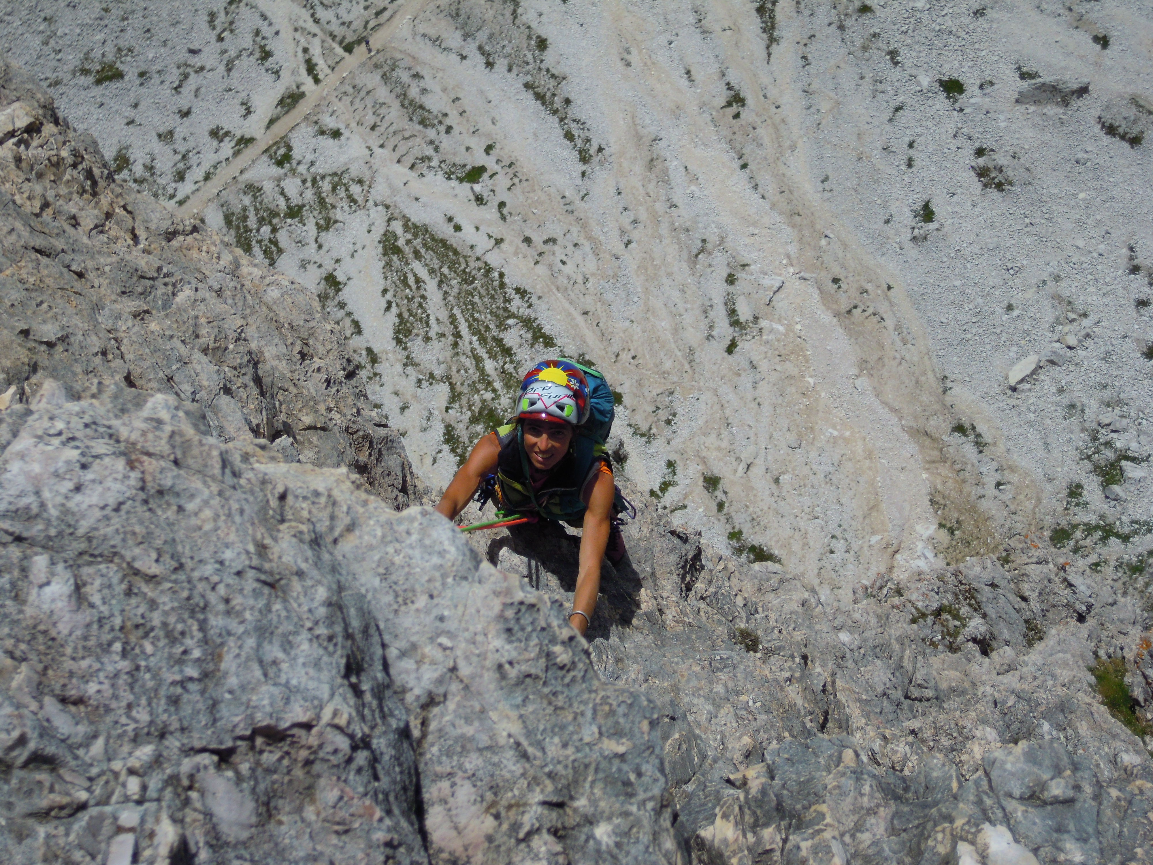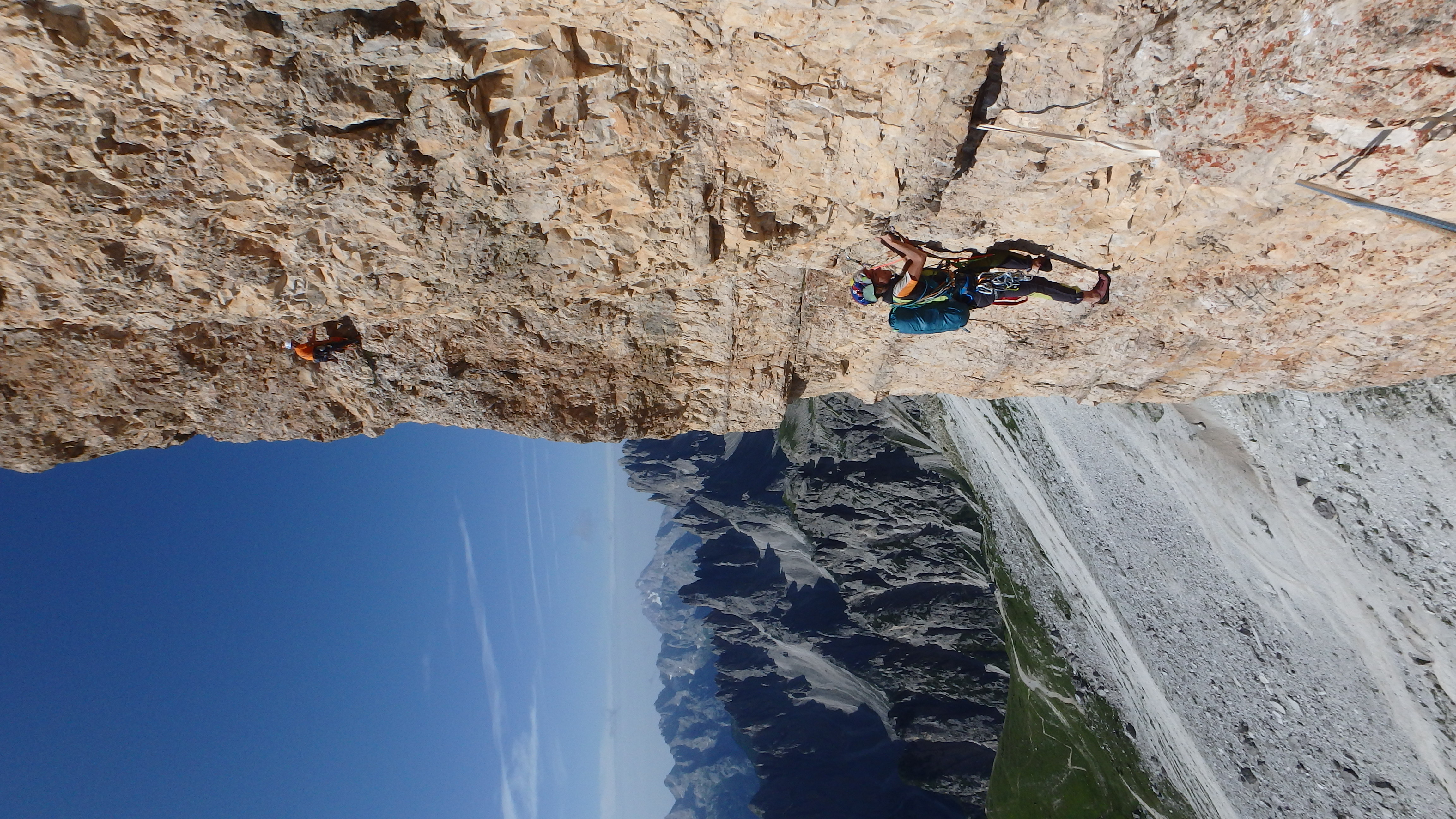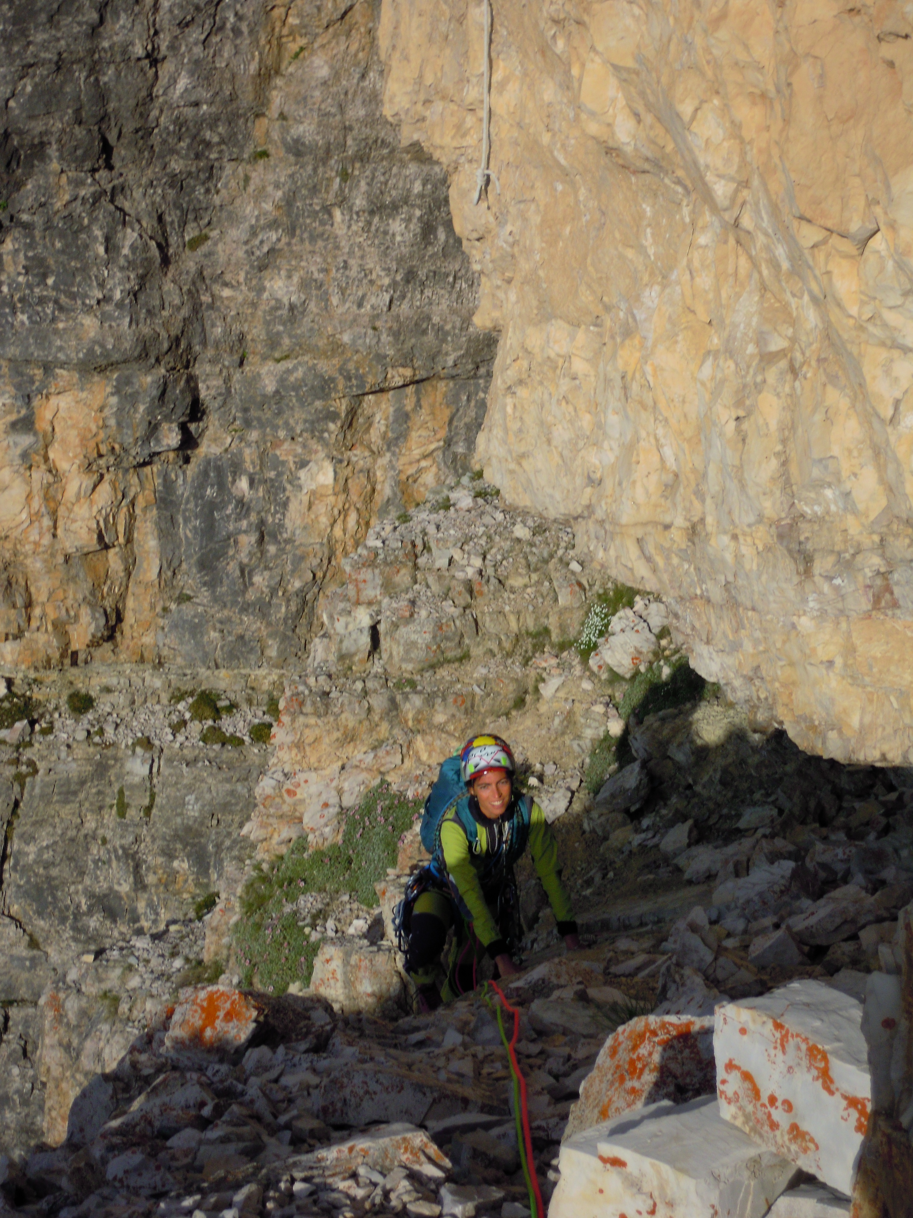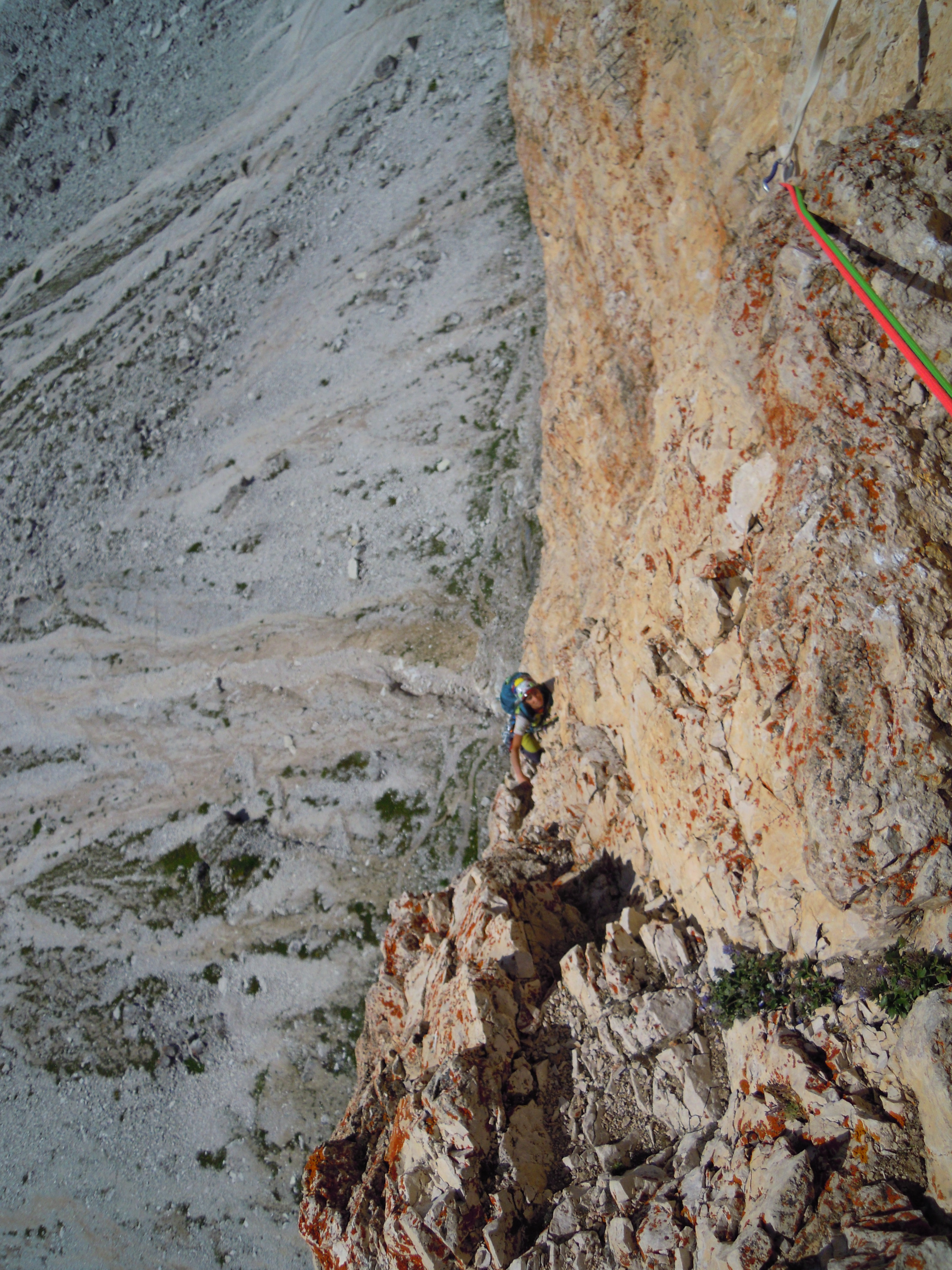La Piccolissima nella luce rosata dell’alba era ancora più bella e man mano che ci si avvicinava, le sue pareti scoscese e strapiombanti incombevano su di noi. Come mi son sentita piccola… che impressione quei “gialli” sopra le nostre teste! Tiro dopo tiro la parete si faceva dura ed interessante, tiro dopo tiro si capiva la stoffa e l’anima di quella cima che, a torto è stata chiamata Piccolissima, solo per un mero confronto con le sorelle maggiori… Strapiombi, traversi, rocce che solo a guardarle ballavano, arrampicata molto continua e molto di testa, dove la paura più grossa era di non tirare addosso ai compagni sotto niente di niente (anche perché, molti dei sassi che abbiamo toccato e che ballavano avevano le dimensioni di lavatrici, forni a microonde ecc). Da un tiro piovevano giù gocce tonde e argentate che percorrevano la distanza tra i tetti sovrastanti e noi illuminandosi come piccole sfere d’argento e poi spaccandosi sulle nostre braccia..potevo seguirne il volo, incantata.