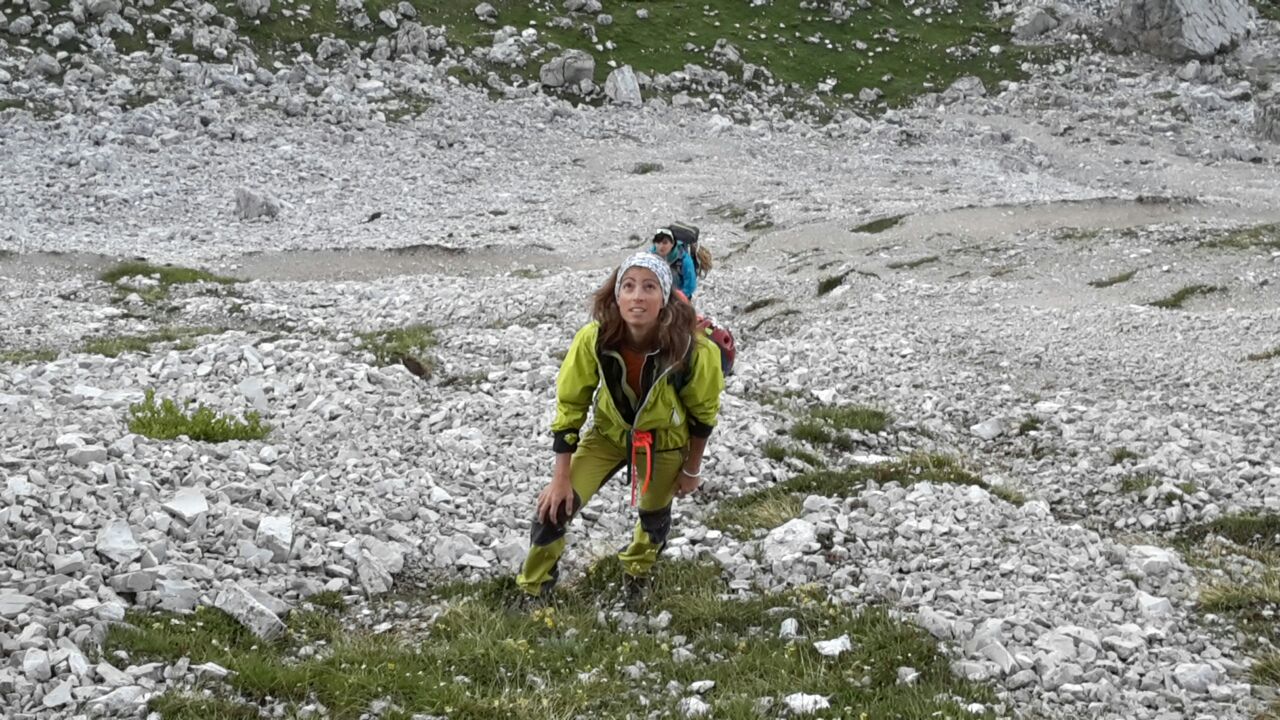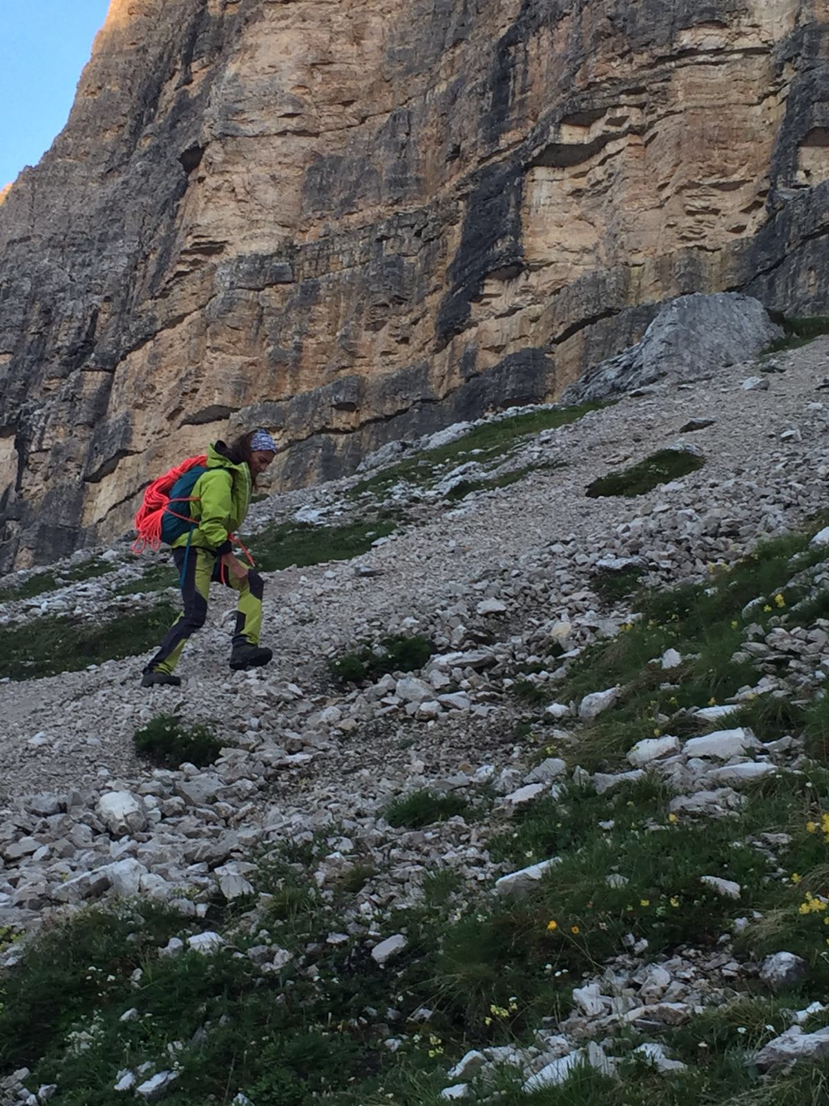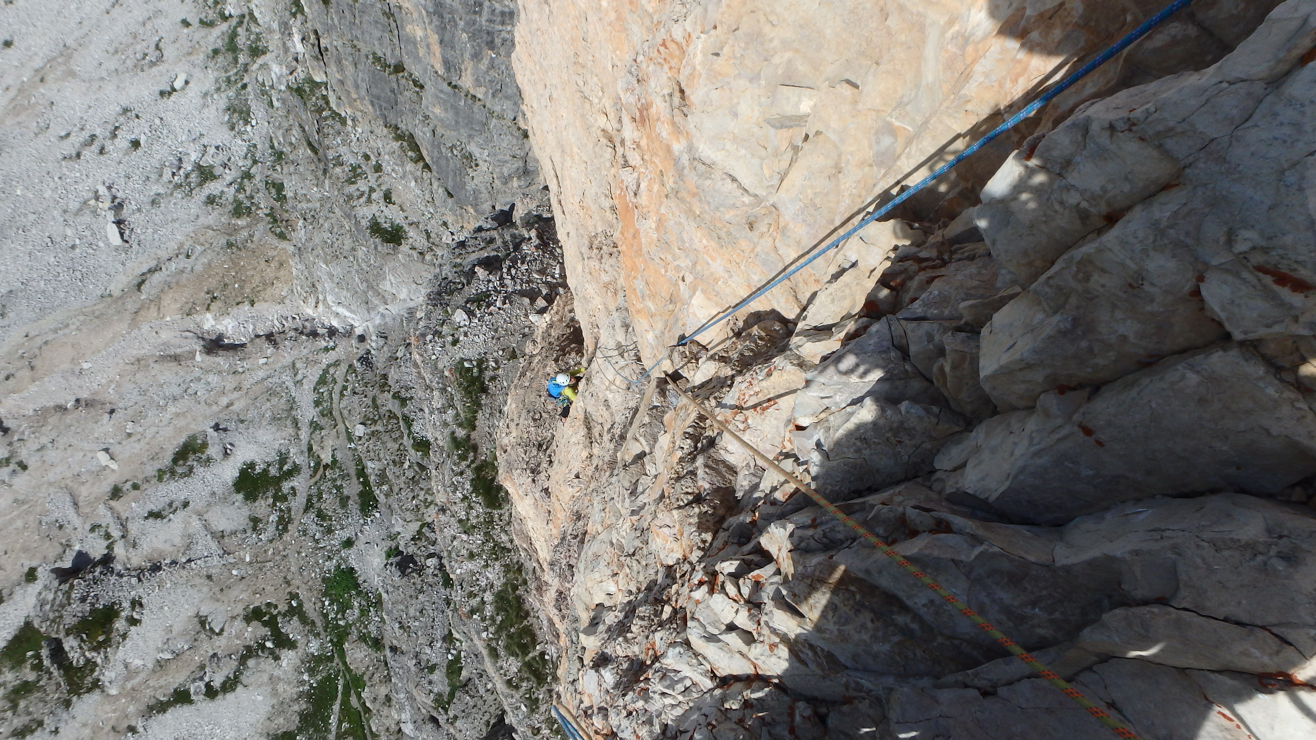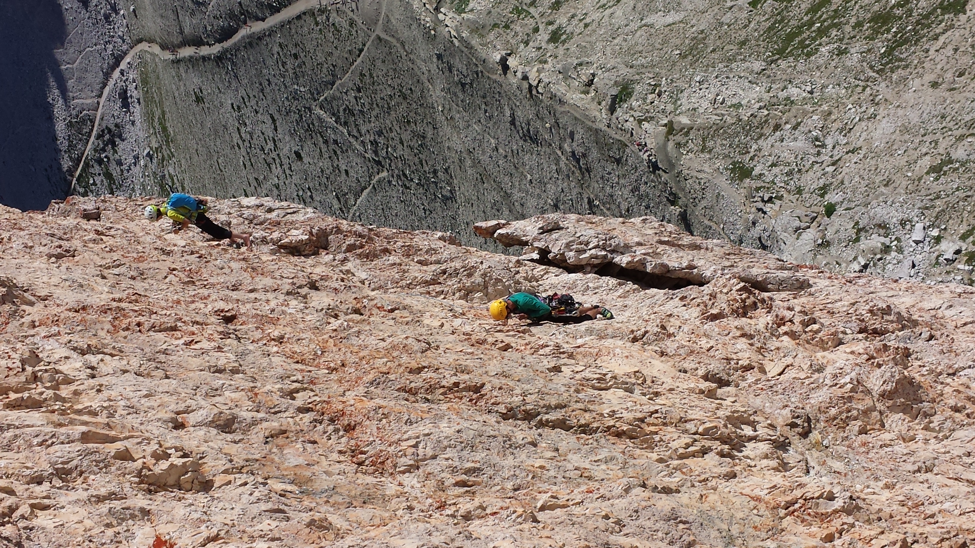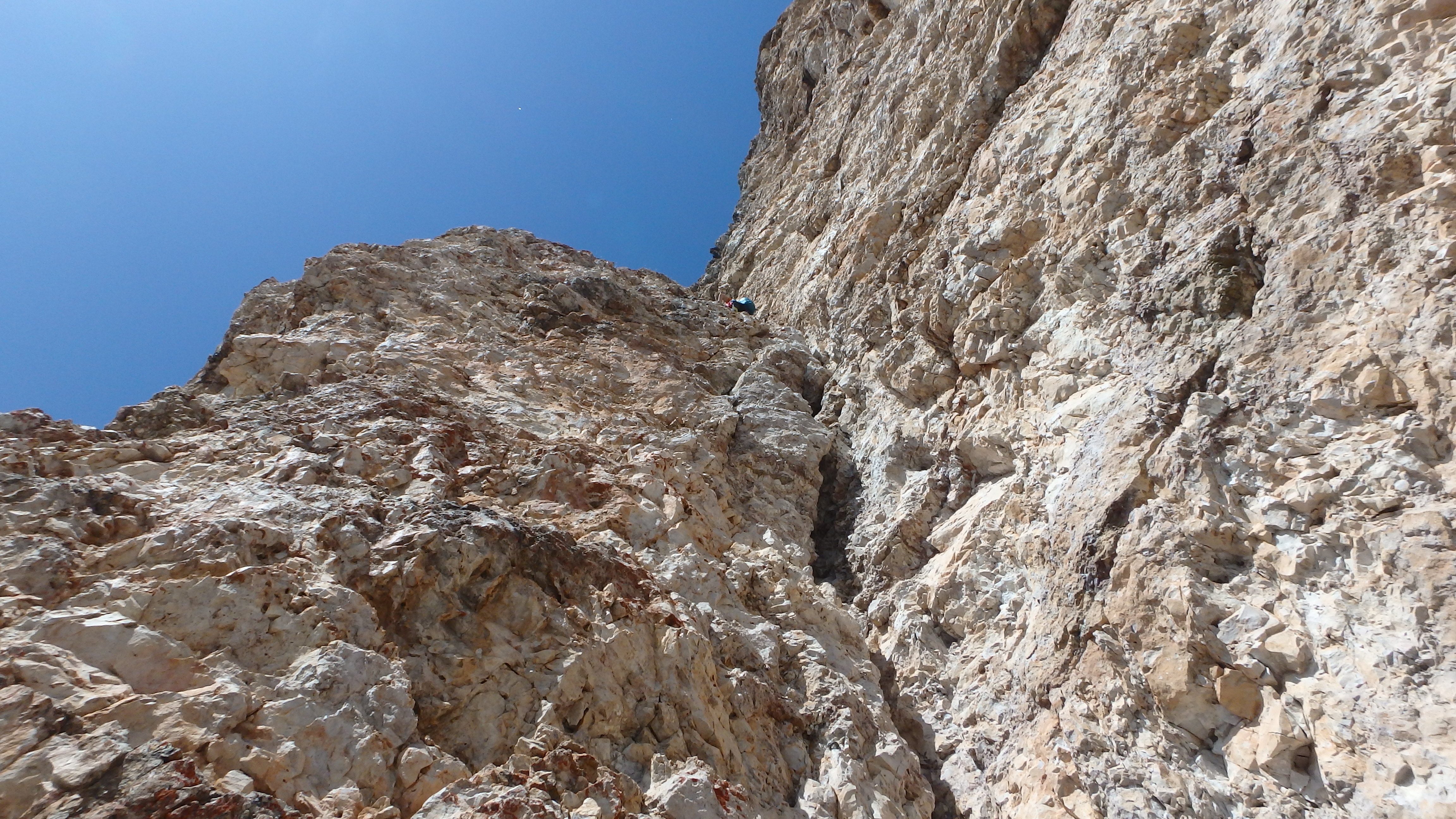 La Piccolissima nella luce rosata dell’alba era ancora più bella e man mano che ci si avvicinava, le sue pareti scoscese e strapiombanti incombevano su di noi. Come mi son sentita piccola… che impressione quei “gialli” sopra le nostre teste! Tiro dopo tiro la parete si faceva dura ed interessante, tiro dopo tiro si capiva la stoffa e l’anima di quella cima che, a torto è stata chiamata Piccolissima, solo per un mero confronto con le sorelle maggiori… Strapiombi, traversi, rocce che solo a guardarle ballavano, arrampicata molto continua e molto di testa, dove la paura più grossa era di non tirare addosso ai compagni sotto niente di niente (anche perché, molti dei sassi che abbiamo toccato e che ballavano avevano le dimensioni di lavatrici, forni a microonde ecc). Da un tiro piovevano giù gocce tonde e argentate che percorrevano la distanza tra i tetti sovrastanti e noi illuminandosi come piccole sfere d’argento e poi spaccandosi sulle nostre braccia..potevo seguirne il volo, incantata.