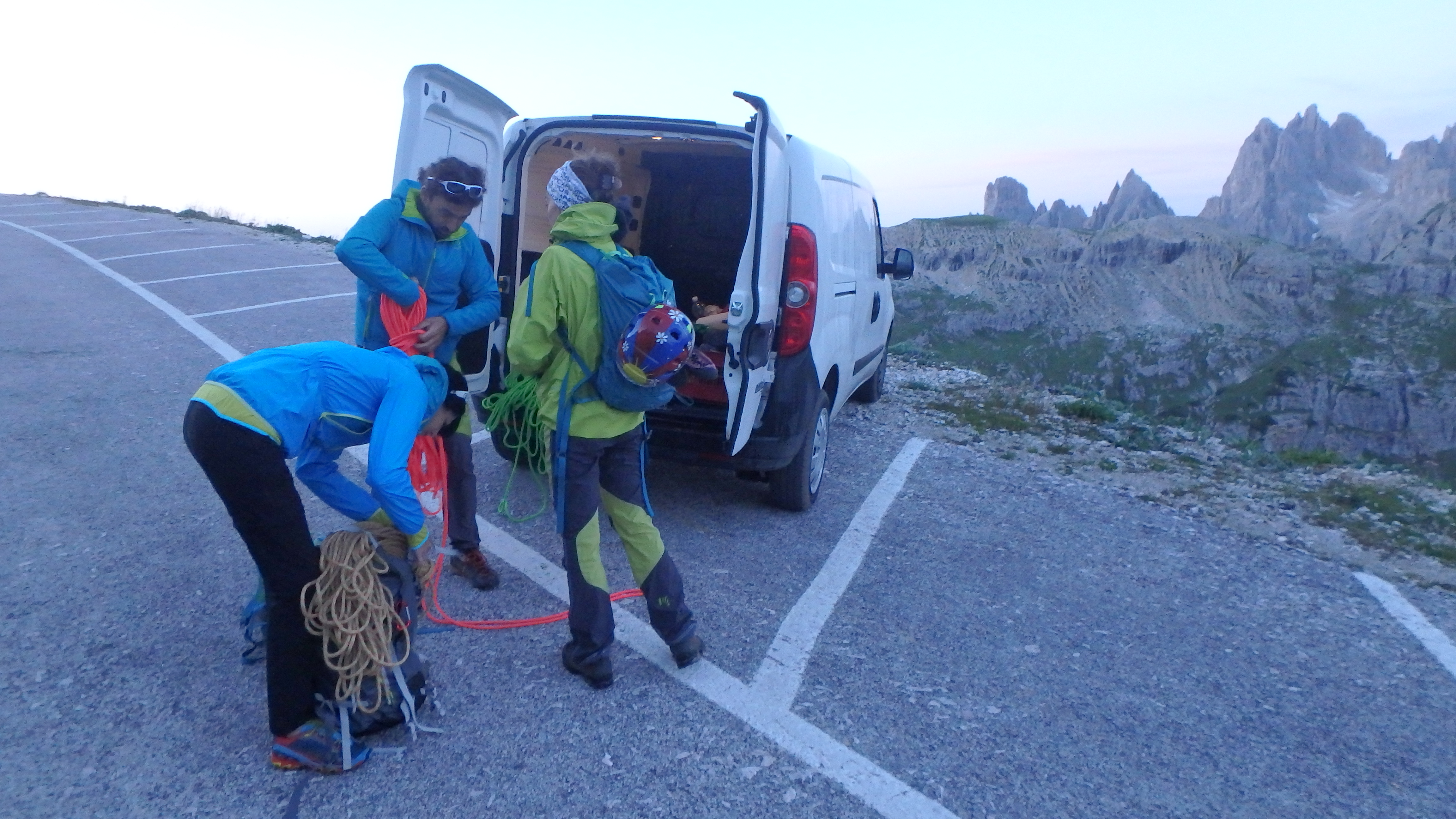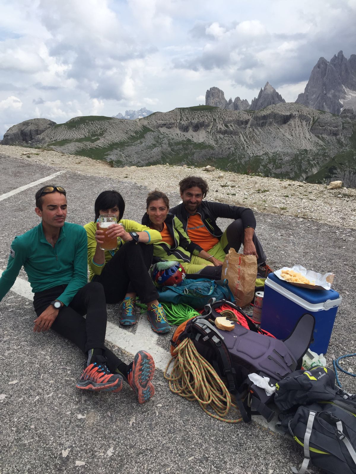 Vista la pioggia, ci siamo chiusi nella supermacchina di Gian e abbiamo schiacciato un pisolino nei nostri sacchi a pelo. Il sole ci ha sorpresi e il lago ci invitava a godere di tanta bellezza. Difficile esprimere il nervoso misto a eccitazione che precede una grande salita come quella che ci aspettava. La sera, dopo una mangiata pantagruelica, dalle nostre auto-casa, ci siamo anche messaggiate Emma ed io…un po’ agitate, un po’ nervose, un po’ preoccupate, ma sicuramente con la voglia di metterci in gioco e andare a curiosare quella torre così ardita.