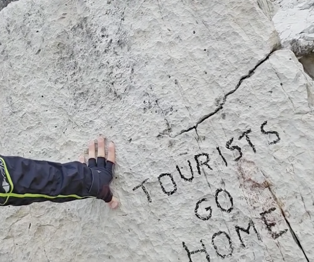 La scritta “Tourists go home” scoperta dall’alpinista e atleta paralimpico Moreno Pesce