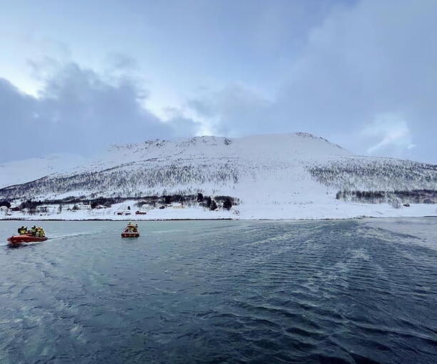 Foto arch.Norwegian Society for Sea Rescue (Redningsselskapet, RS) Soccorritori al lavoro vicino al luogo della valanga sull’isola di Reinoya, Norvegia settentrionale, 31 marzo 2023.