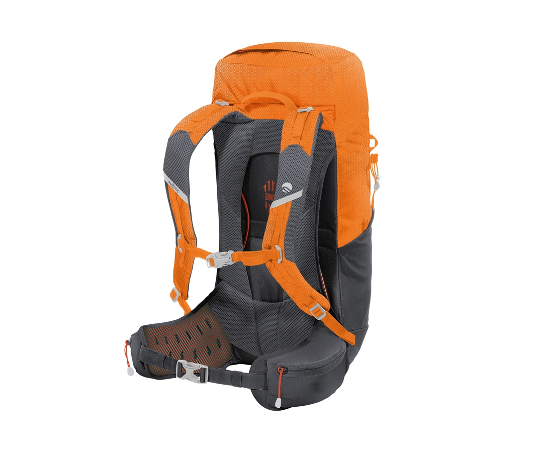- Dorso: Dorso con sistema “Dry Net System”: il bastino in acciaio flessibile, oltre a garantire una perfetta distribuzione del carico, permette di tensionare la rete che separa lo zaino dalla schiena dell’utilizzatore, garantendo un elevato livello di aerazione. Spallacci con imbottitura auxetica per aumentare l’aerazione.