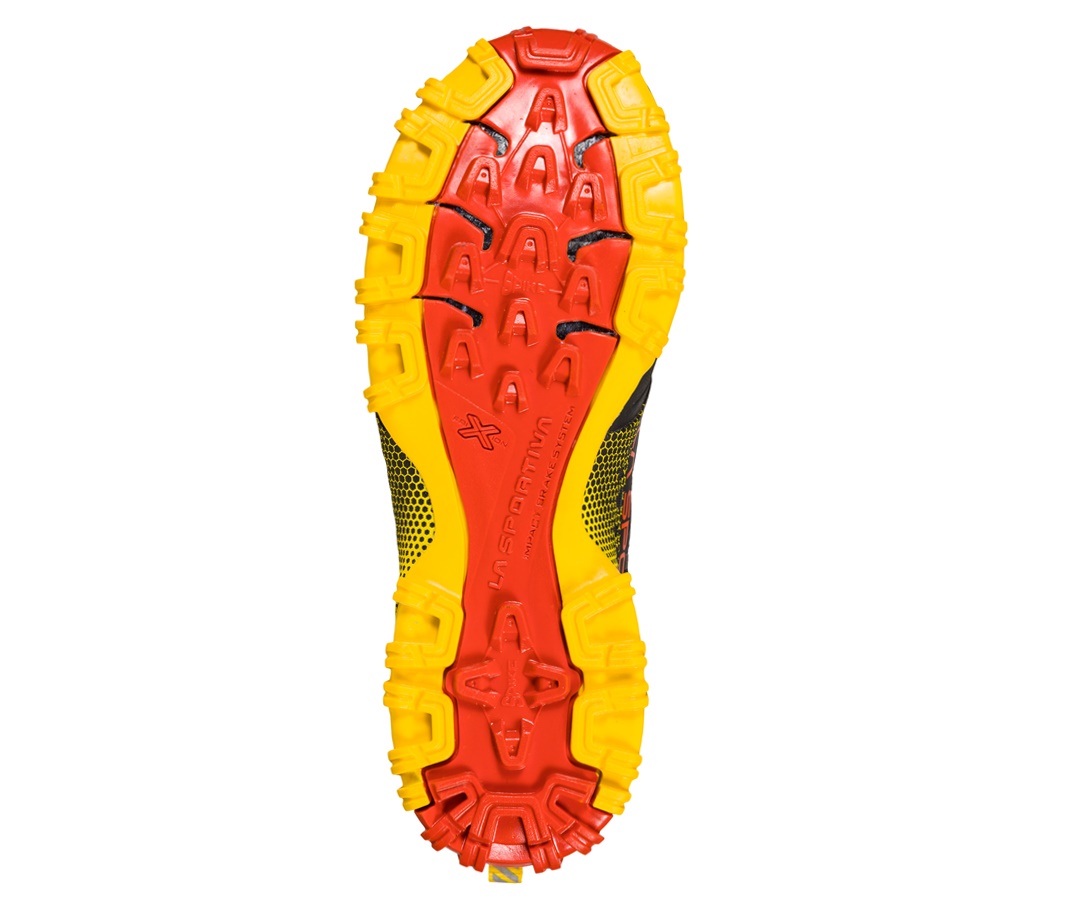 La suola bi-mescola FriXion Red presenta superfici di appoggio differenziate: la forma arrotondata dei tasselli esterni che salgono lateralmente a toccare l’intersuola, crea un angolo di appoggio graduale con il terreno mantenendo la stabilità anche in casi di torsioni estreme del piede. Questo permette di correre in sicurezza anche sui terreni più tecnici in presenza di radici, sassi e rami. Massimo sostegno e fasciatura sulla parte mediale del piede, libertà di movimento e comfort in punta. Il risultato è una calzatura che in puro stile La Sportiva offre soluzioni nuove alle richieste dei runners più esigenti, riscrivendo le regole del gioco con una costruzione mai vista prima nelle calzature da trail running.