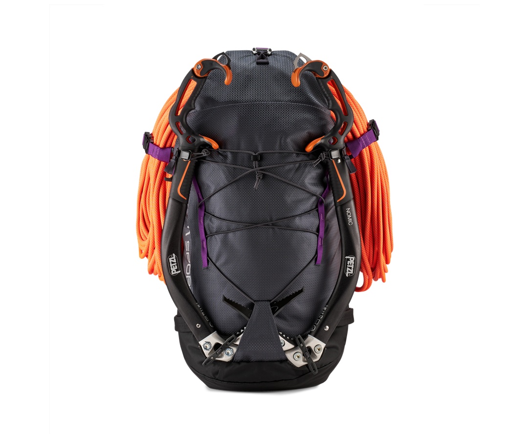 Il comparto principale è accessibile dall’alto tramite una chiusura a coulisse oppure lateralmente grazie a una comoda zip idrorepellente. Il cappuccio estensibile protegge l’attrezzatura, indipendentemente dal carico, e consente di fissare facilmente corde lunghe. Gli accessori esterni removibili includono porta-piccozza o porta-bastoncini da trekking e un cordino elastico