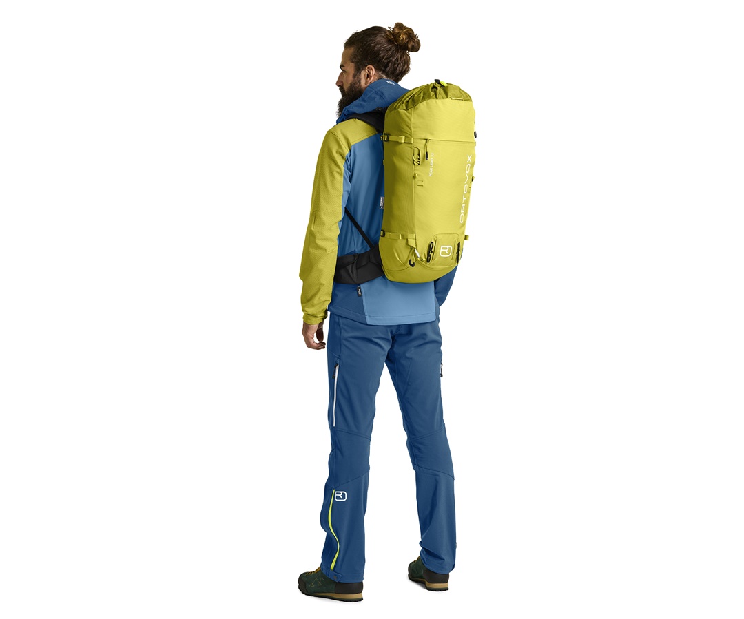 Il PEAK LIGHT è il nostro zaino da alpinismo 4 stagioni più tecnico e unisce un peso relativamente basso a robustezza e caratteristiche che soddisfano gli alpinisti e i professionisti più esigenti. Il disegno e la vestibilità specifica permettono di approcciare la parete con forte carico ma anche di scalare agevolmente. Il casco può essere posizionato, a scelta, sul dorso o sul cappuccio, il doppio porta picozze è molto pratico e fissa in modo stabile anche gli attrezzi più pesanti. Il porta sci diagonale è a scomparsa, sotto il cappuccio si fissa la corda con il suo loop dedicato mentre l’apertura perimetrale permette un accesso rapido all’attrezzatura sul fondo. Chi vuole ridurre ulteriormente il peso può rimuovere la cintura in vita, il cappuccio e il telaio dorsale, il porta piccozza e il D-Skifix. In questo modo, il peso già contenuto può essere ridotto ulteriormente del 30% in poche mosse. Un’altra particolarità è l’innovativo SWISSWOOL HYBRID BACK SYSTEM: nelle zone a contatto particolarmente sollecitate, tre morbidi cuscinetti SWISSWOOL garantiscono un piacevole comfort e un clima corporeo ottimale assorbendo una grande quantità di umidità senza la sensazione di bagnato.